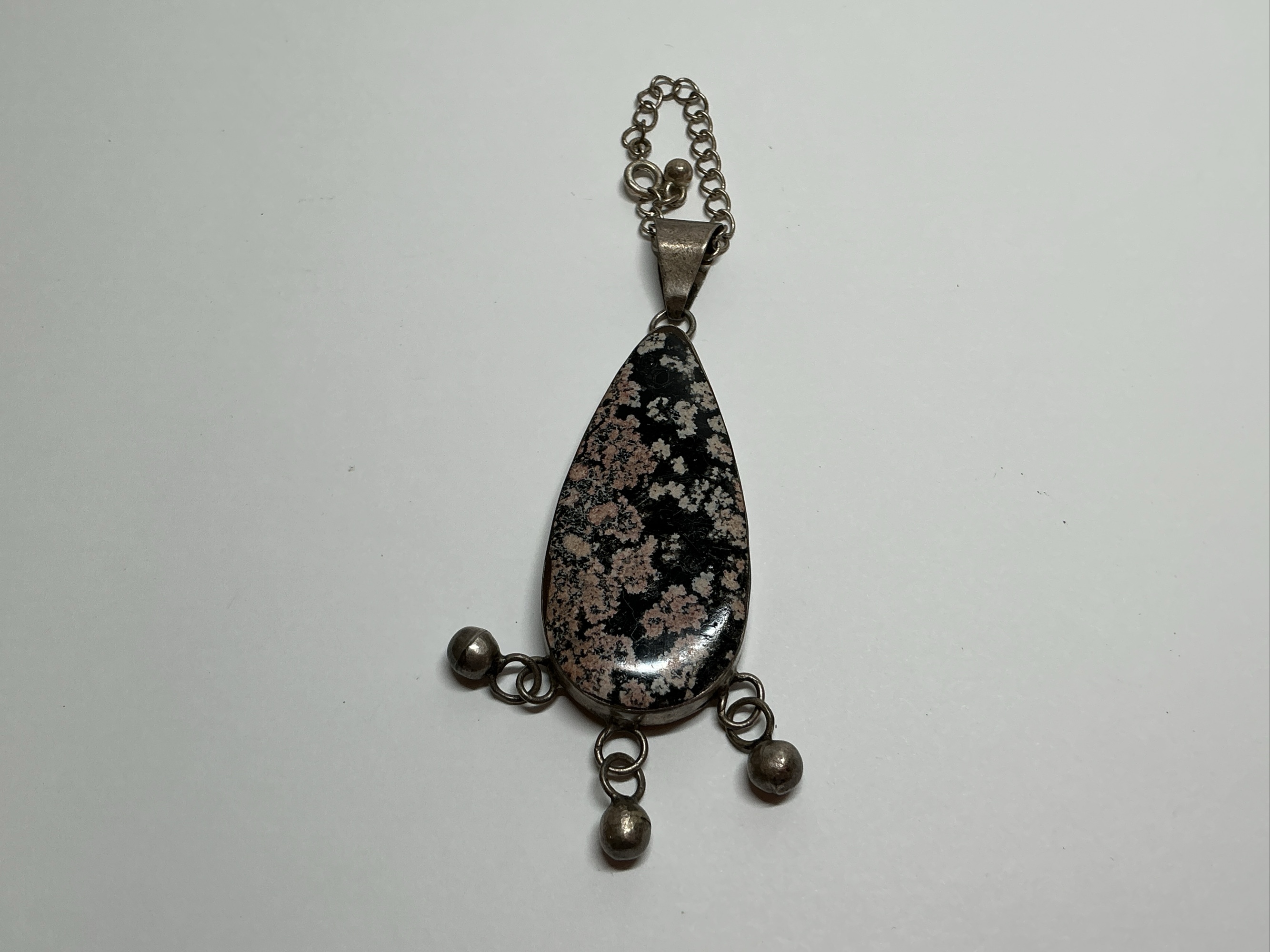 A beautiful pendant featuring a teardrop-shaped obsidian stone set in sterling silver. This pendant has a chain with three hanging silver balls.