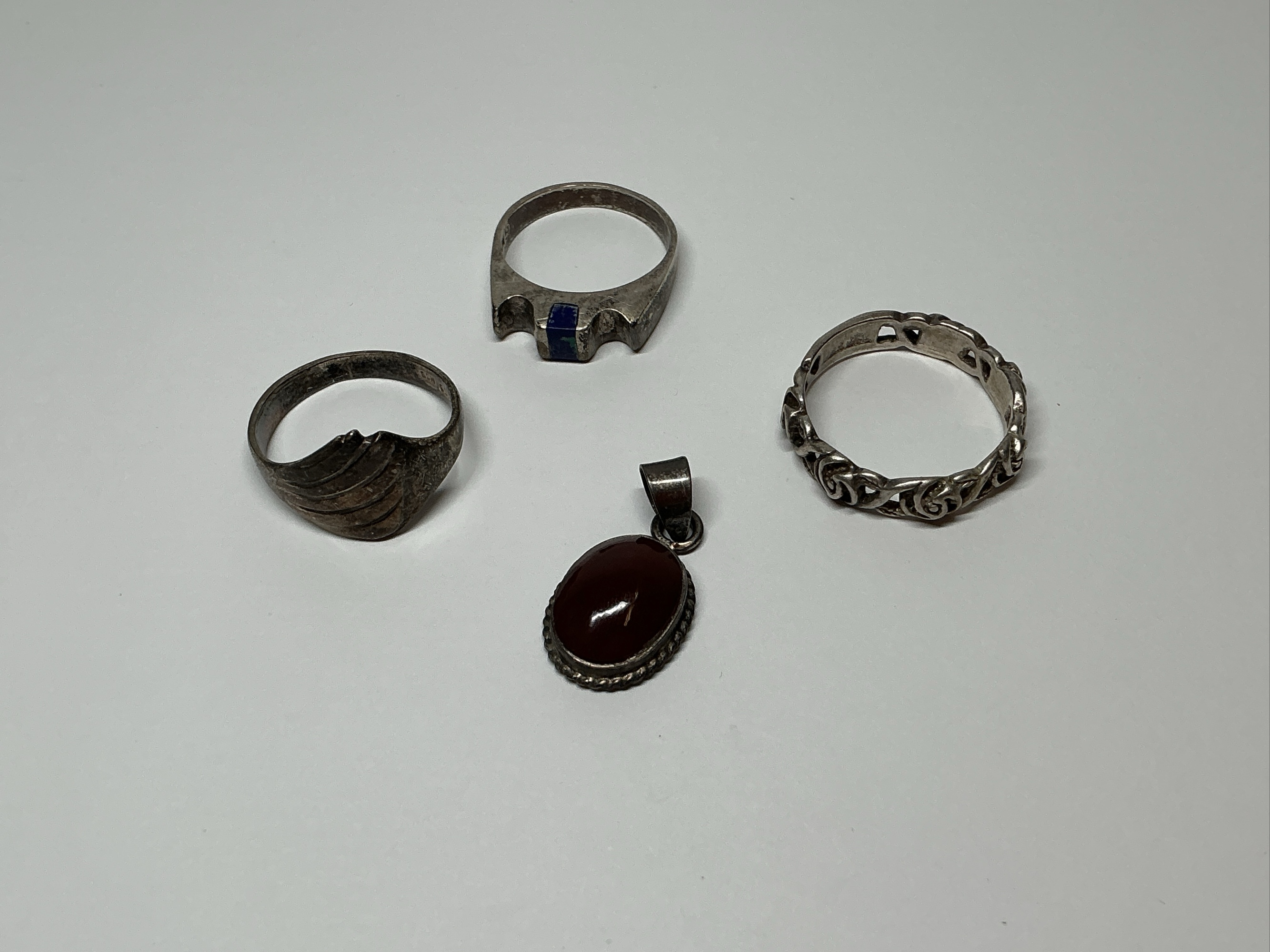 Collection of rings crafted from sterling silver, featuring various designs sizes blue stone 6.5, wave 7.5 and flower 8.5. Also includes one pendant with a gemstone.