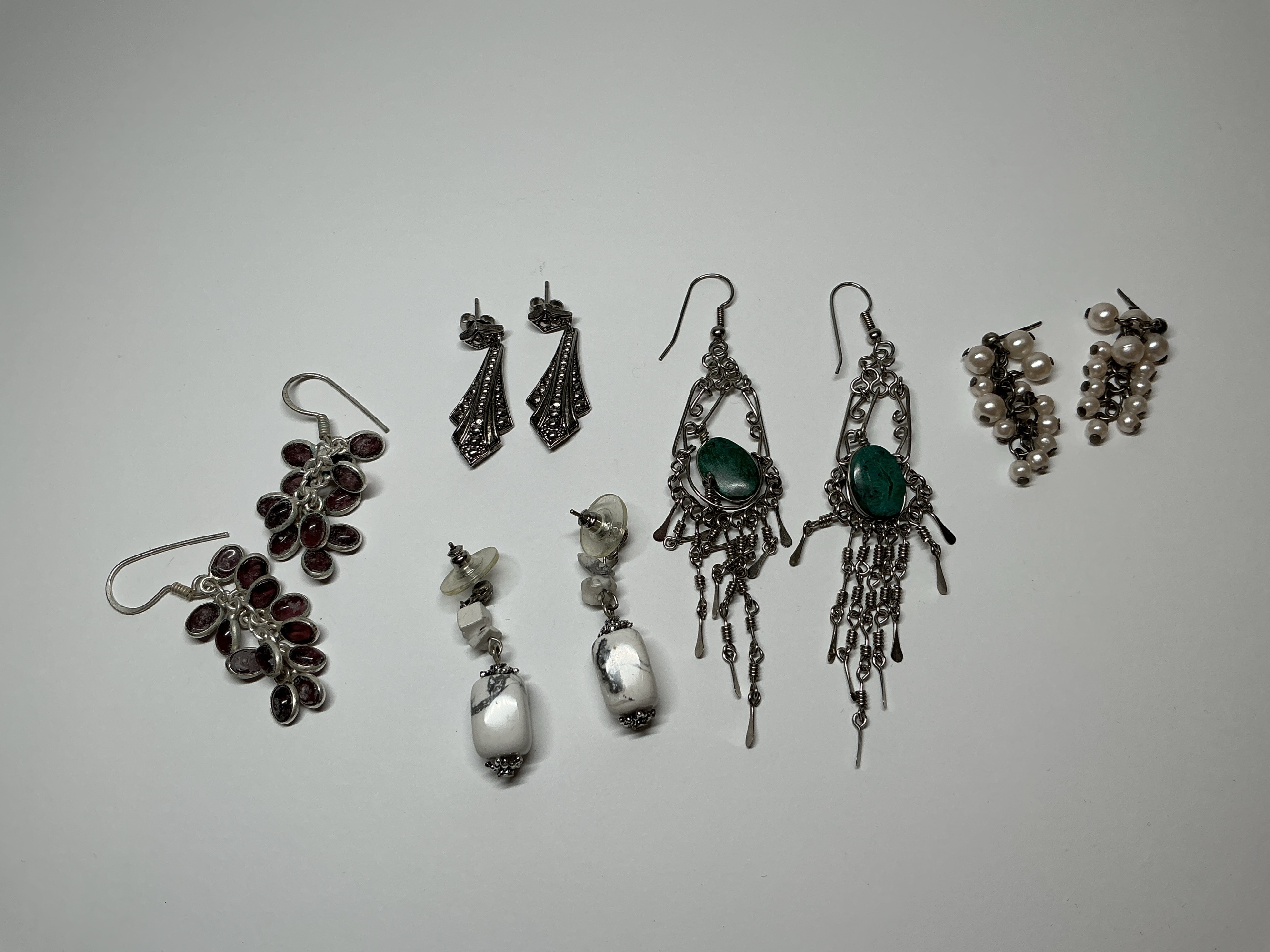This is a mixed lot of five pairs of earrings. The earrings have various designs. There are earrings with raw purple amethyst, pearl beads, Peruvian turquoise, howlite and marcasite. The earrings are designed with silver-tone metal.