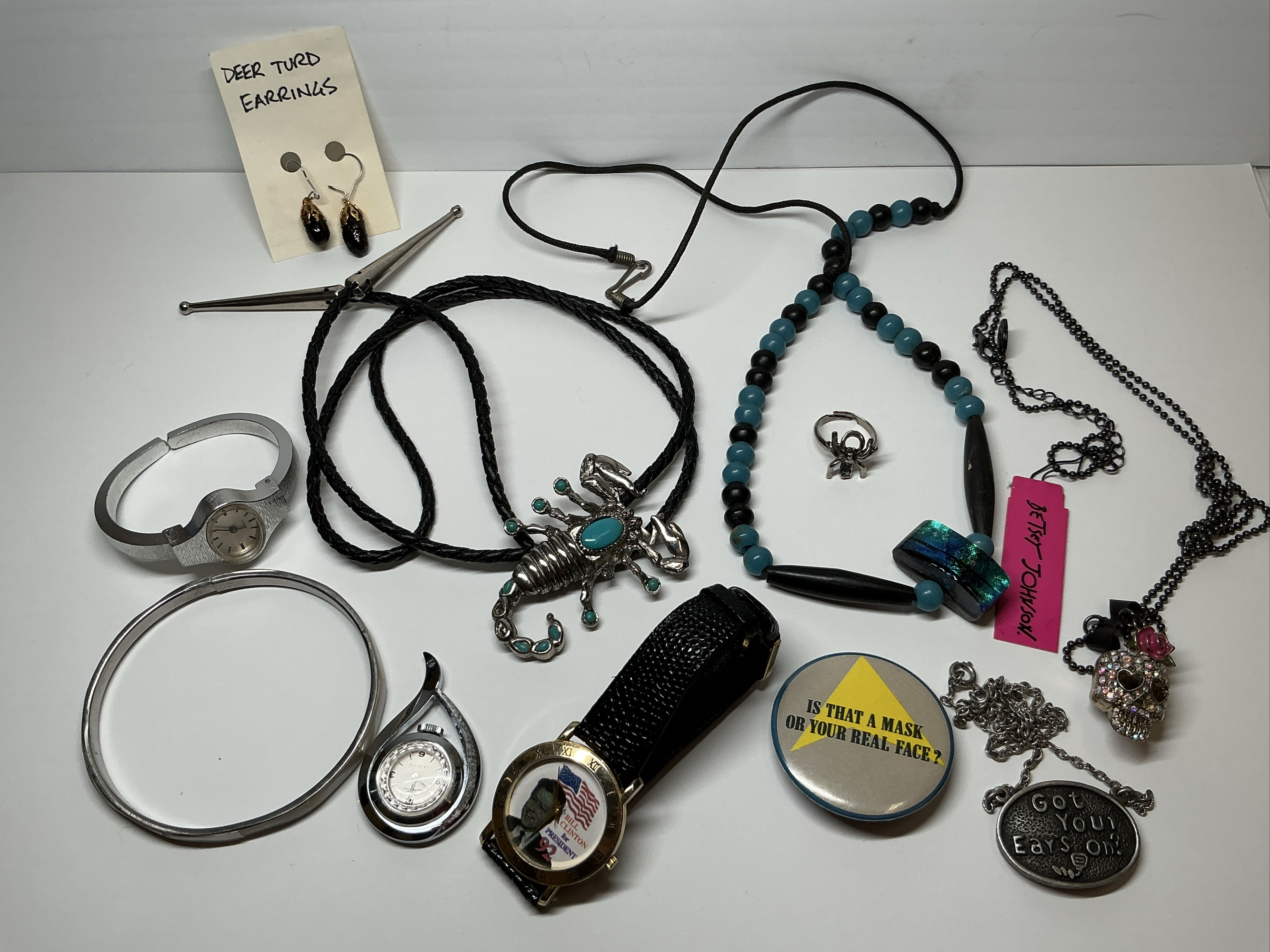 This diverse lot includes a collection of jewelry pieces such as necklaces, earrings, bracelets, and rings, some with unique designs like a scorpion pendant with turquoise accents and 'deer turd' earrings. Also included are various watches including two with bangle bands and two with leather bands, plus other accessories like a bolo tie and pin.