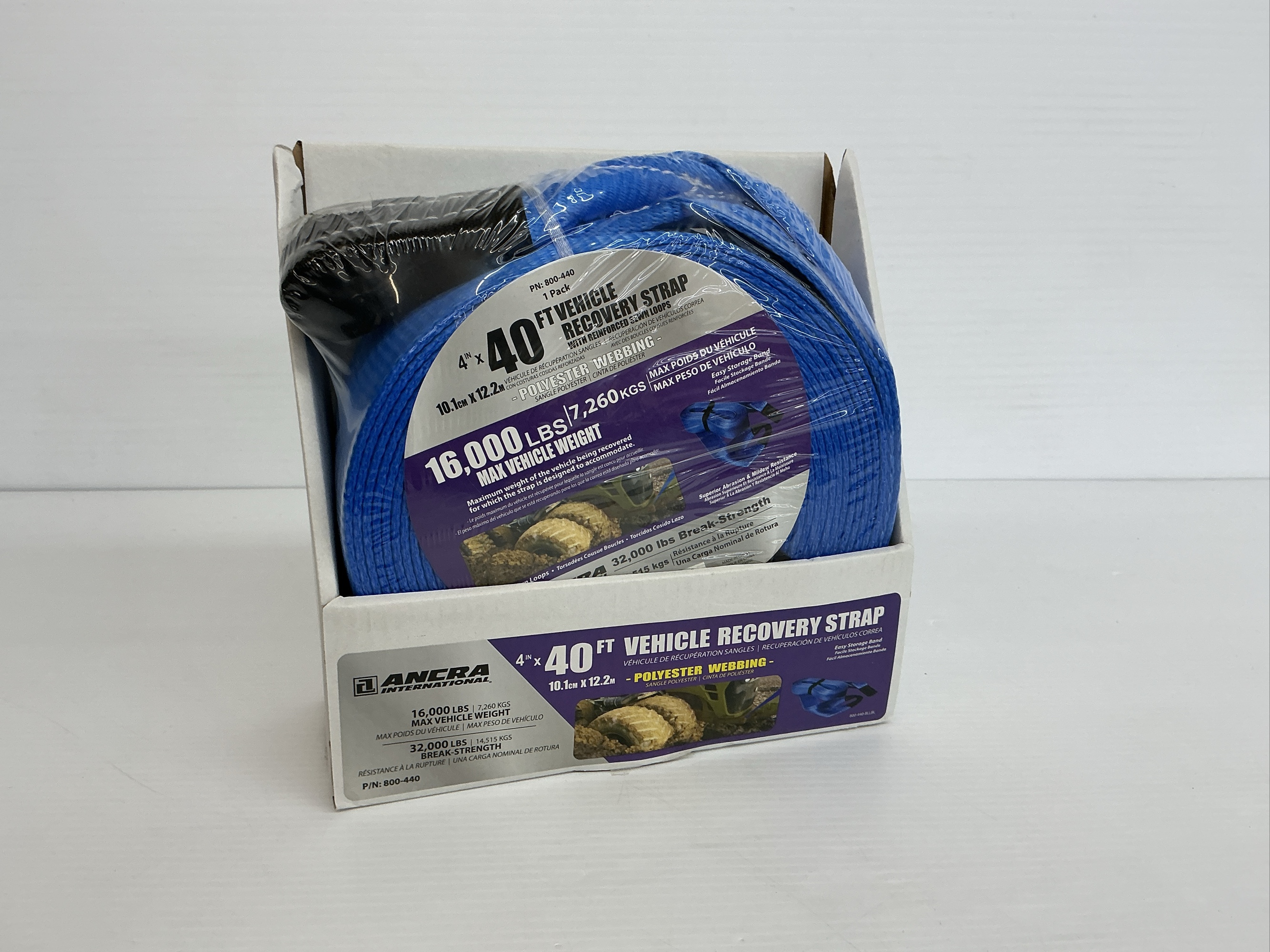 New Ancra Vehicle Recovery Strap. 4 inches x 40 ft with reinforced sewn loops and polyester webbing. Max Vehicle Weight 16,000 LBS / 7,260 KGS
