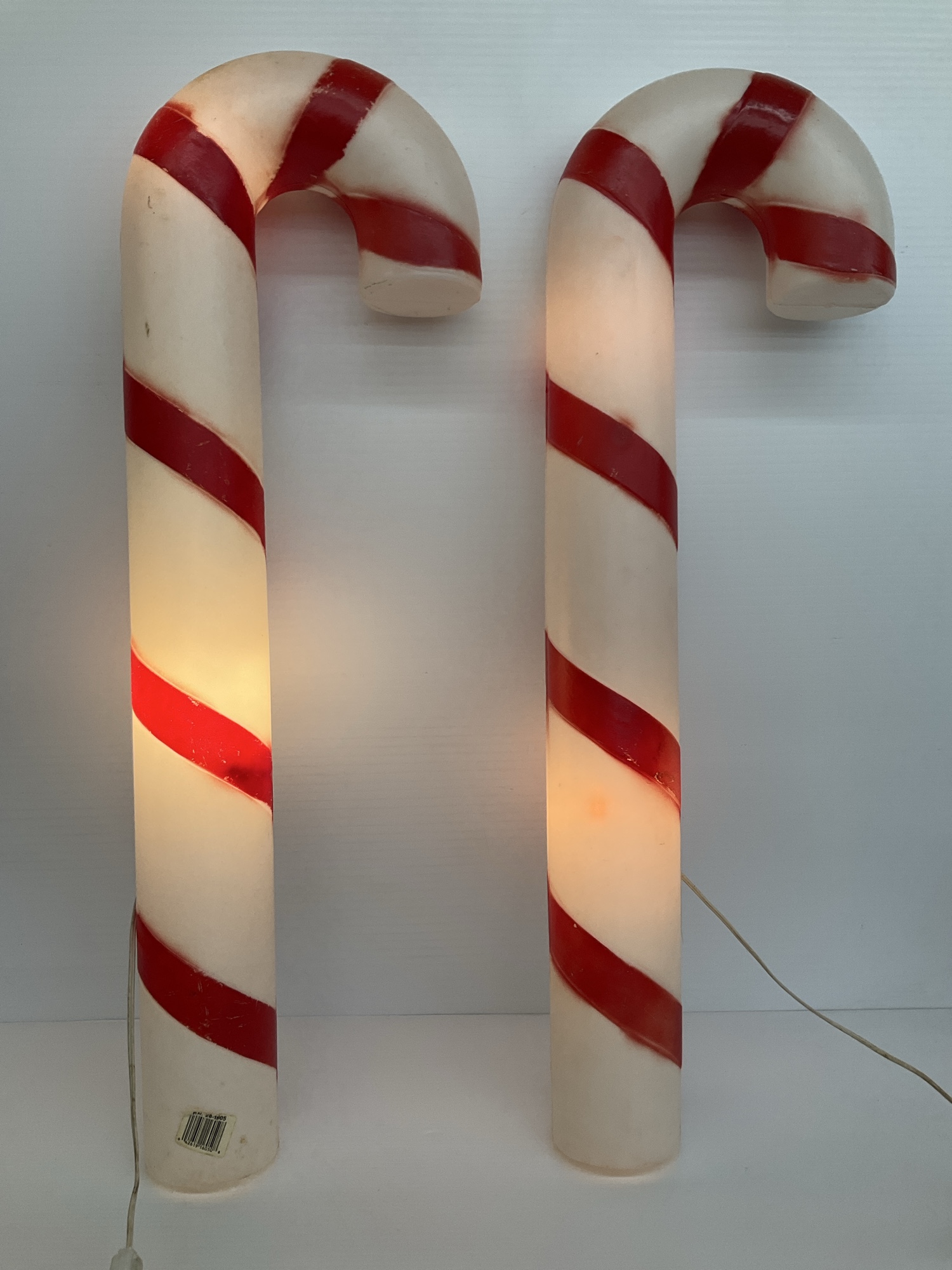 This listing features a pair of lighted candy cane decorations. These would be ideal for indoor or outdoor holiday displays.