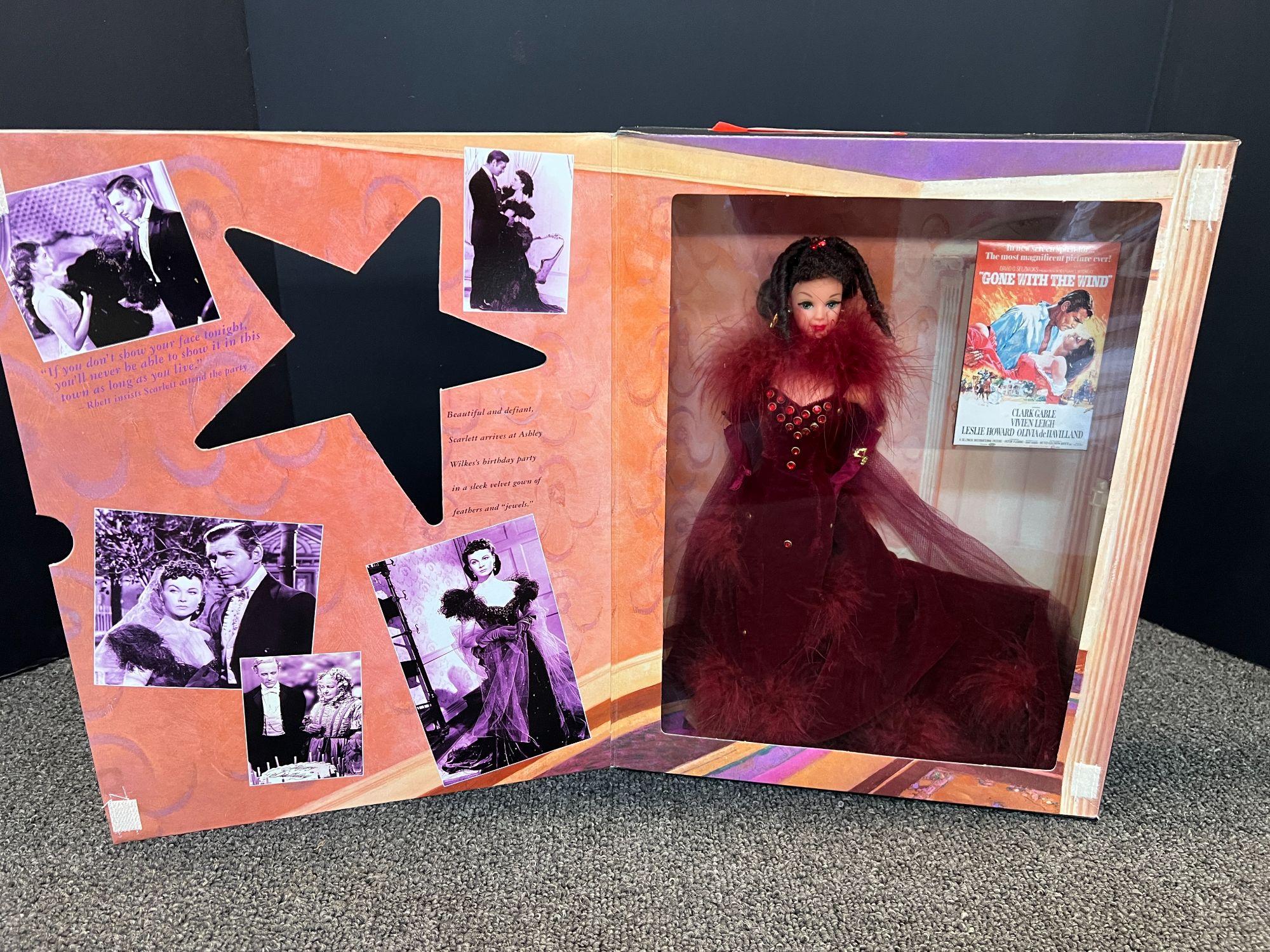 Collectible Barbie doll as Scarlett O'Hara from Gone With the Wind. The doll is displayed in its original packaging.