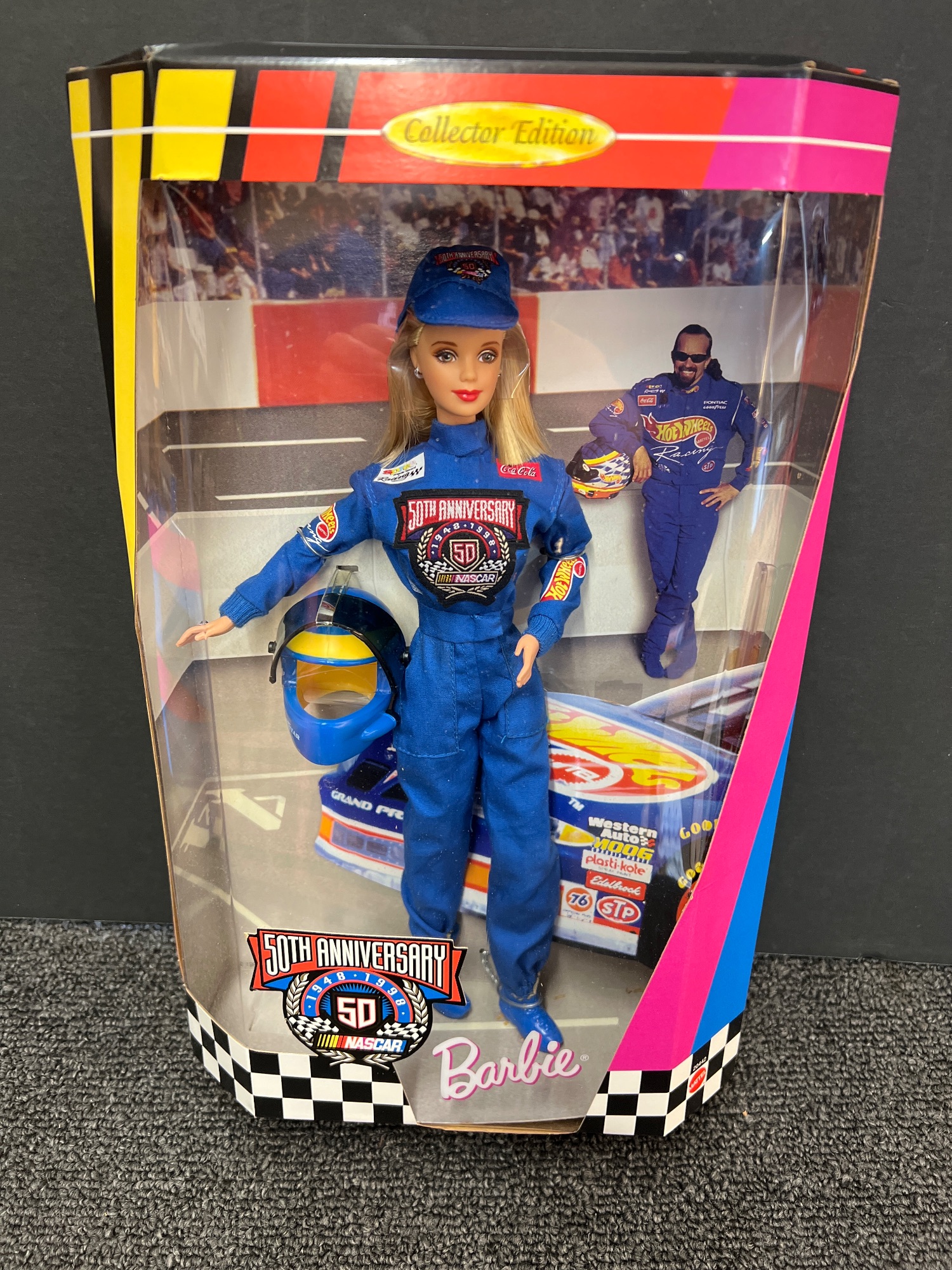 A Barbie doll commemorating the 50th Anniversary of NASCAR, complete with racing suit, helmet, and cap.
