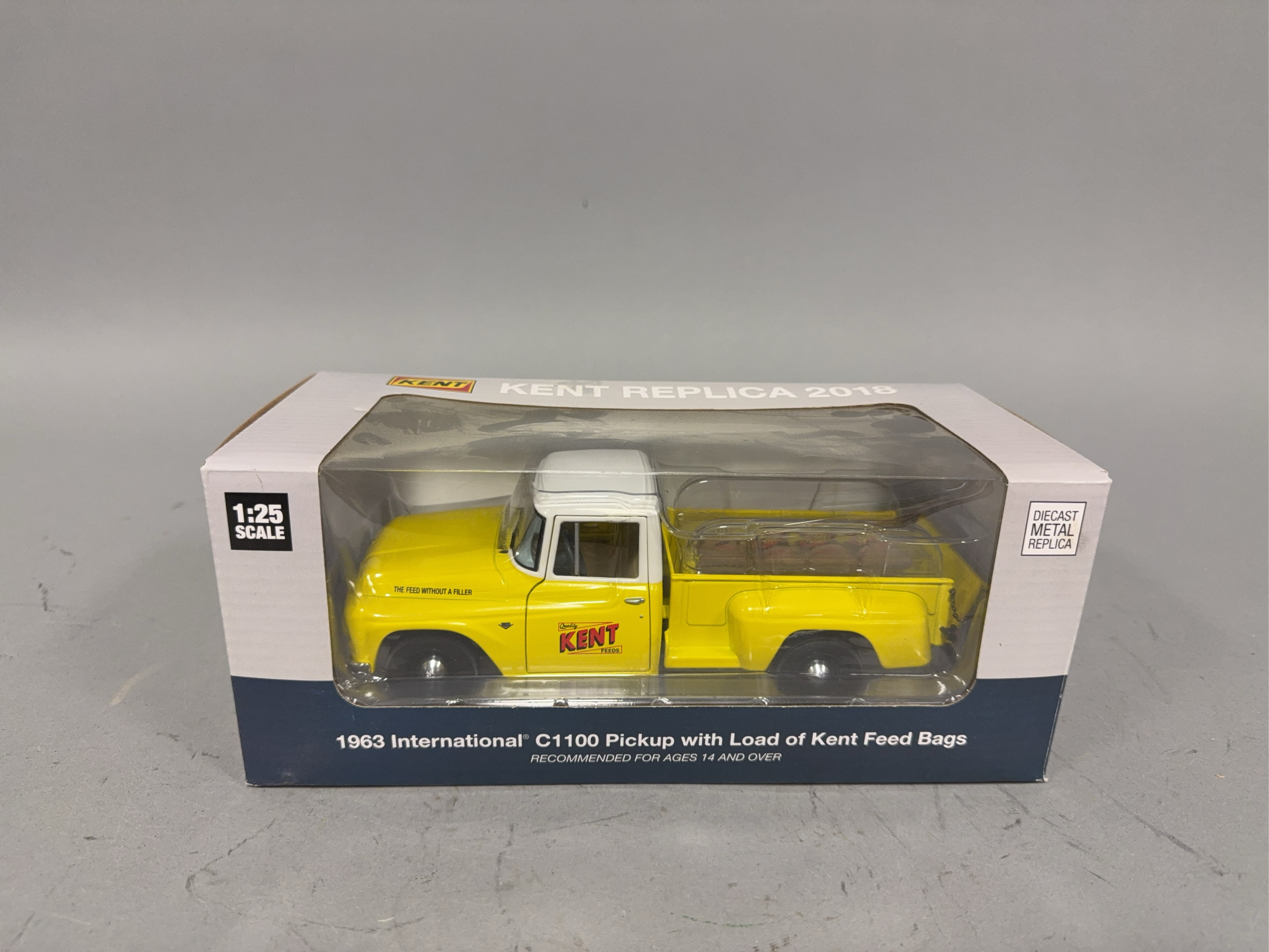 1:25 scale First Gear Kent Replica 2018 1963 International C1100 Pickup with Load of Kent Feed Bags