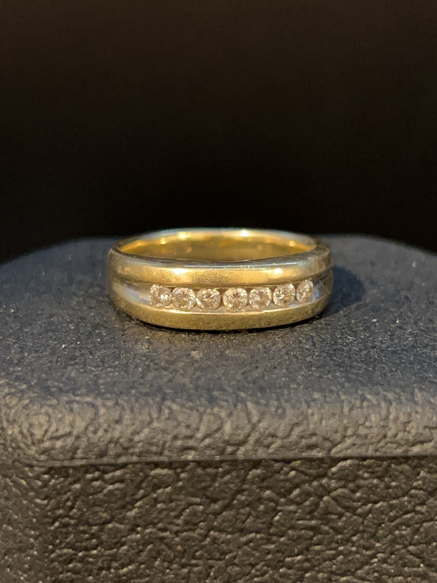 Men’s 14K yellow gold wedding band with 7 single diamonds….. DIAMONDS TESTED POSITIVE USING DIAMOND SELECTOR II TESTER…..7 grams…..size 12