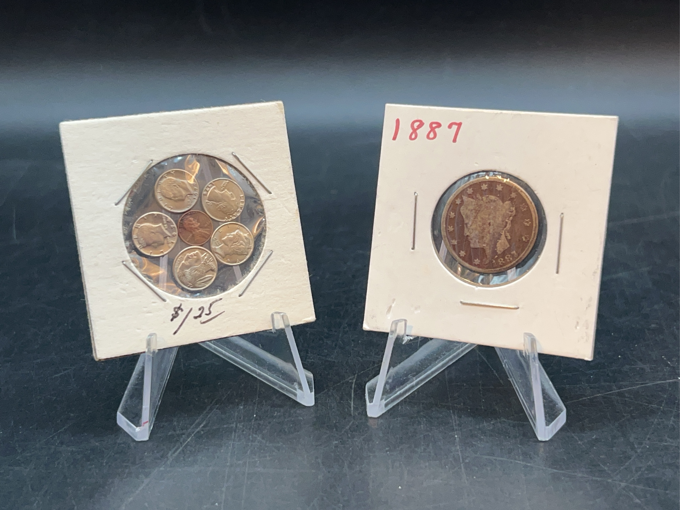 novelty set of "World's Smallest" replica U.S. coins and an 1887 Coronet Head Large Cent (reverse is worn)