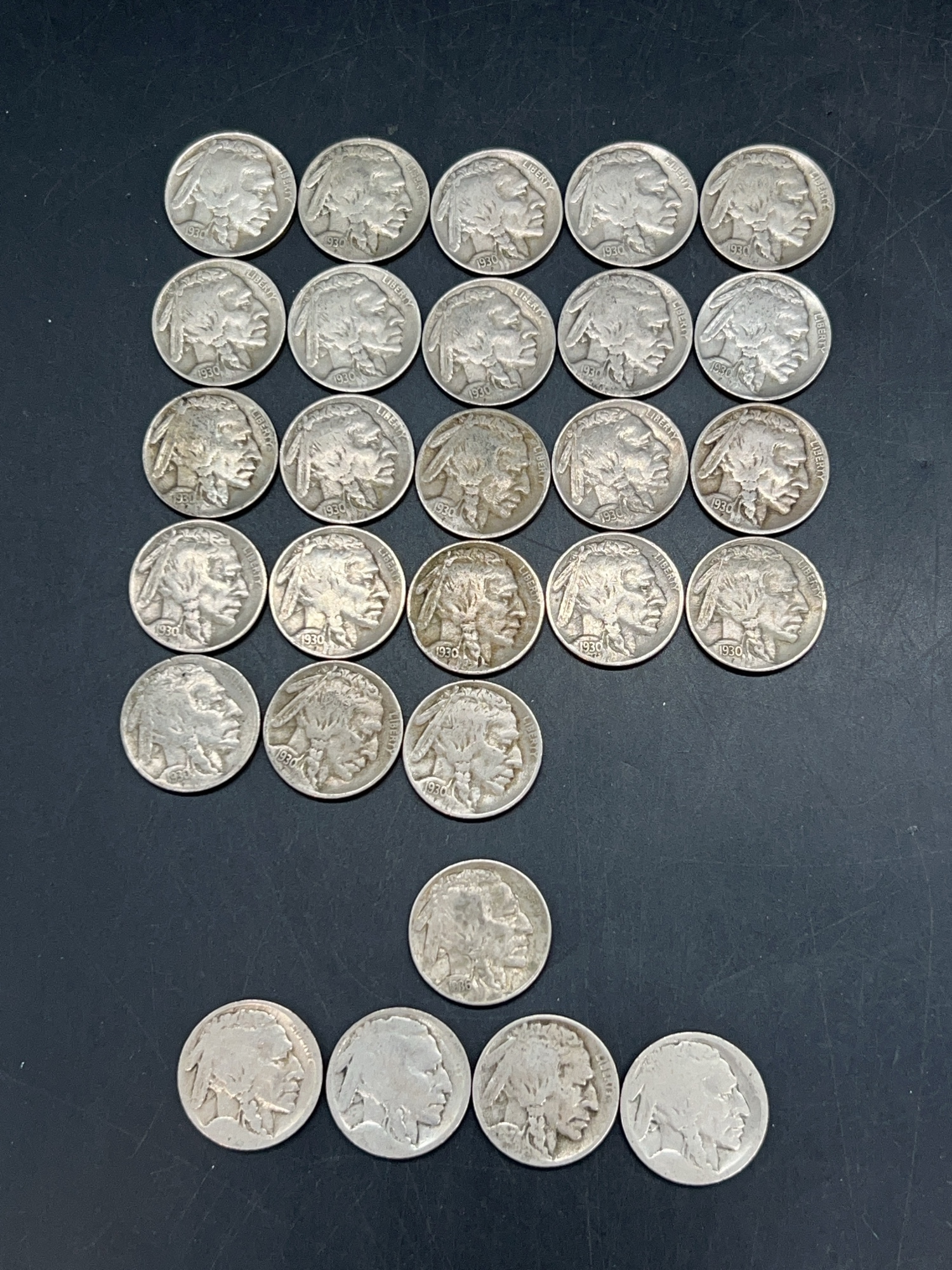(23) 1930-S Buffalo Head Nickels, (1) 1936 with no mint mark and (4) that are quite faded