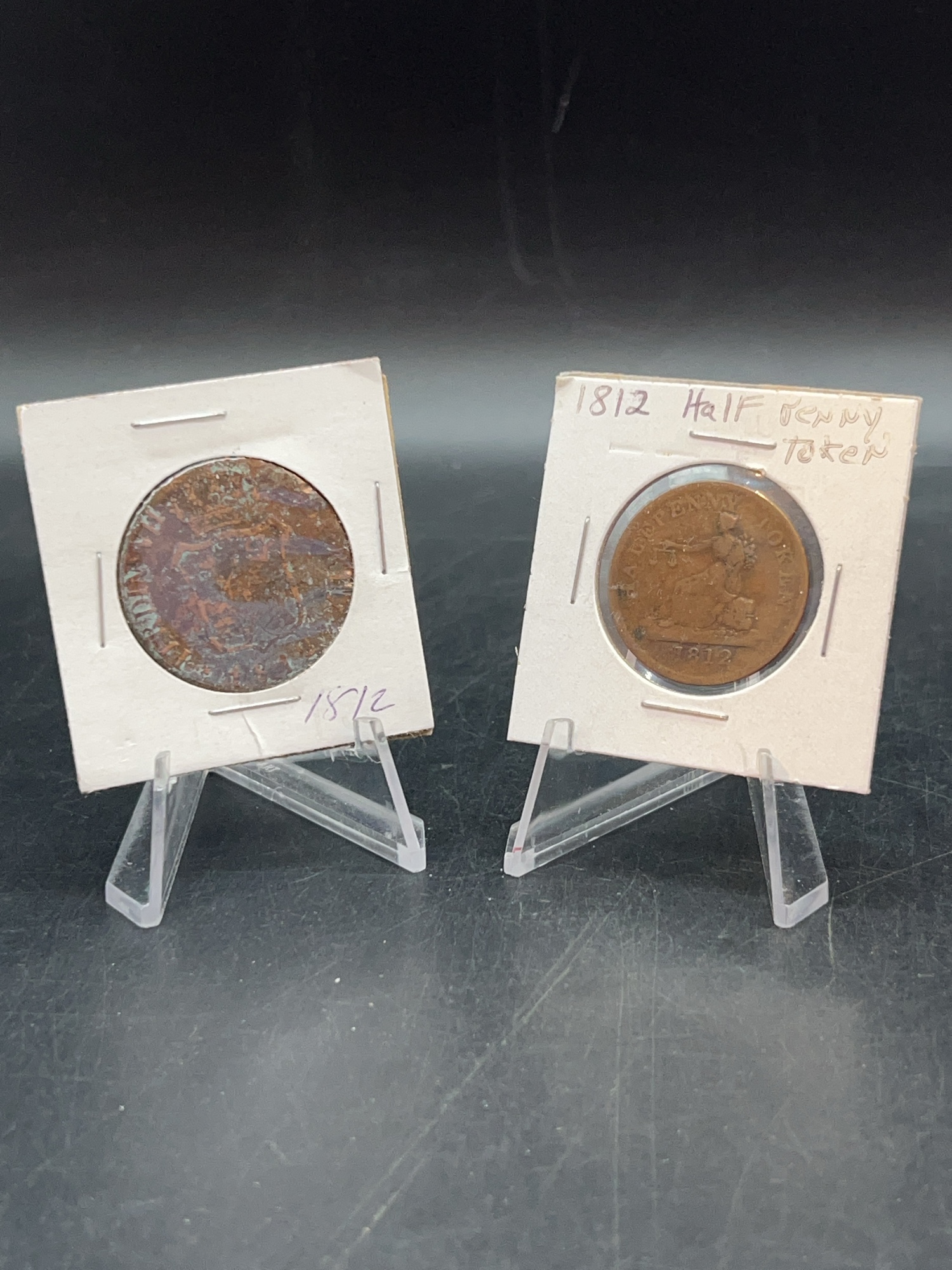 (2) copper coins - 1812 Canadian Half Penny Token and 1812 6 quartos coin from Spain featuring Ferdinand VII