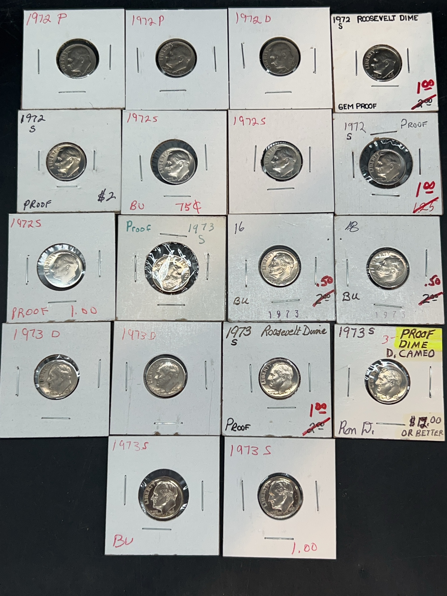 (18) 1972 and 1973 Roosevelt Dimes….mint marks P, S and D