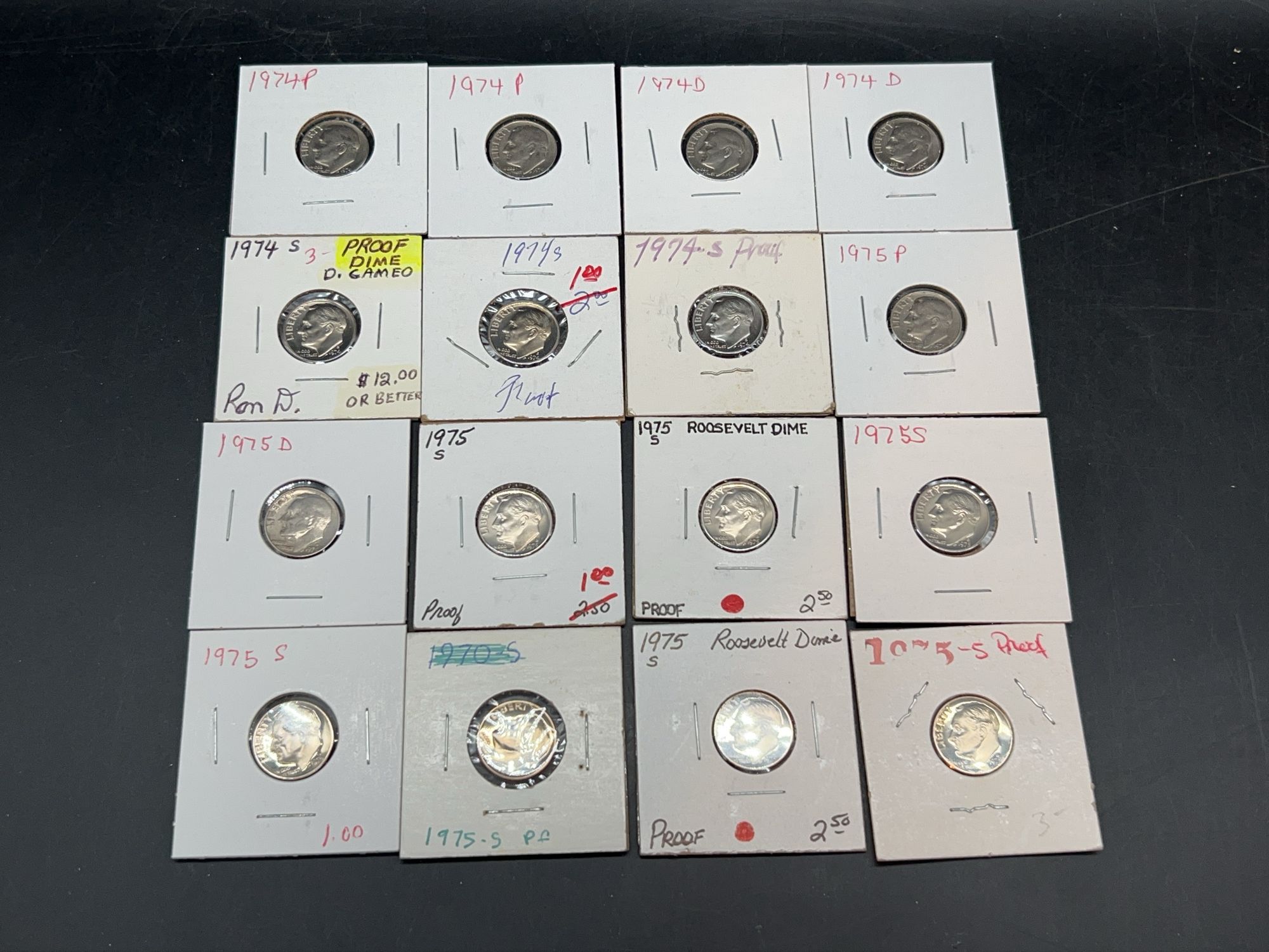 (16) 1974 and 1975 Roosevelt Dimes….mint marks P, S and D