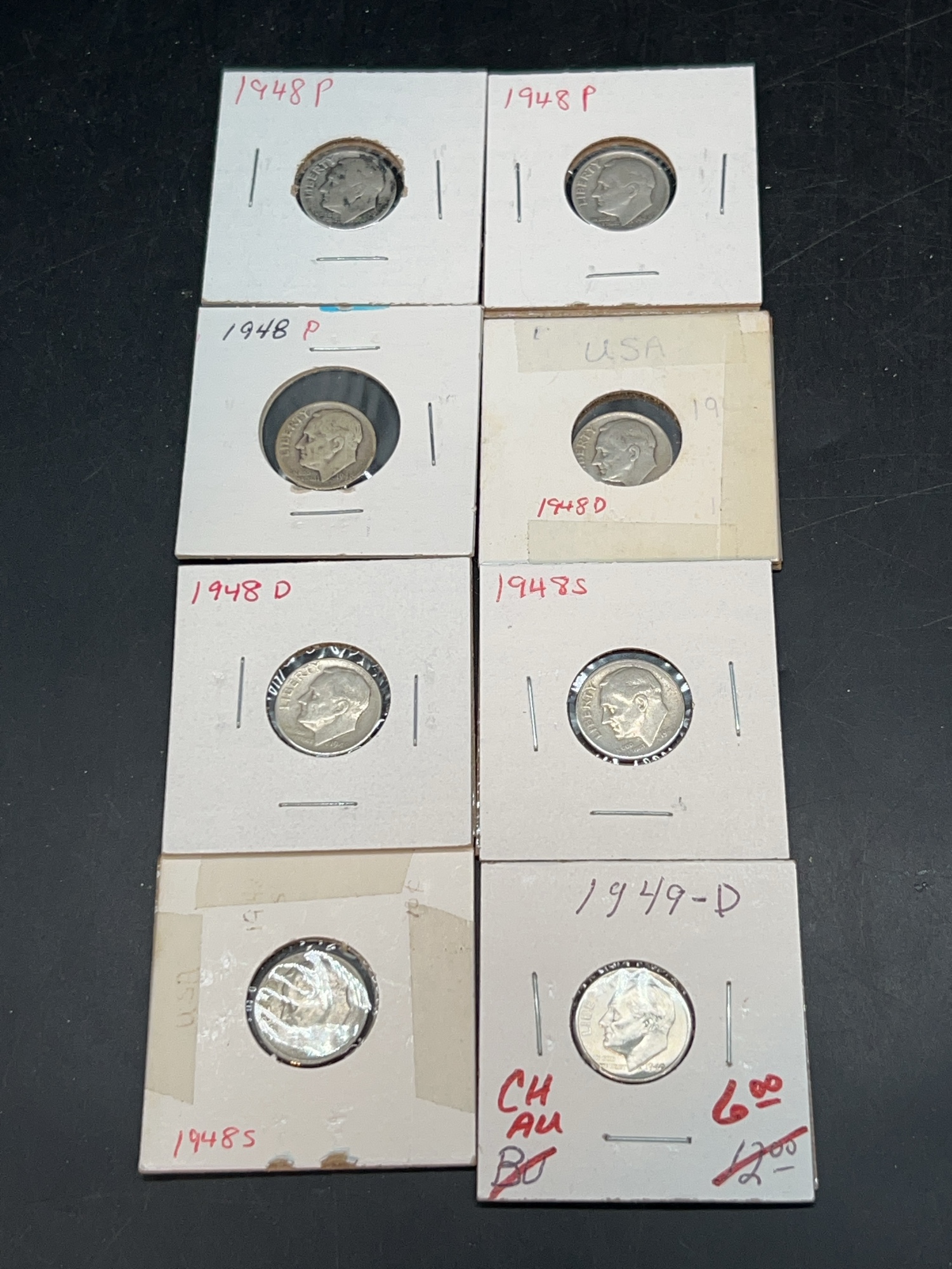 (7) 1948 and (1) 1949-D Roosevelt Silver Dimes…..1948 mint marks are P, D and S