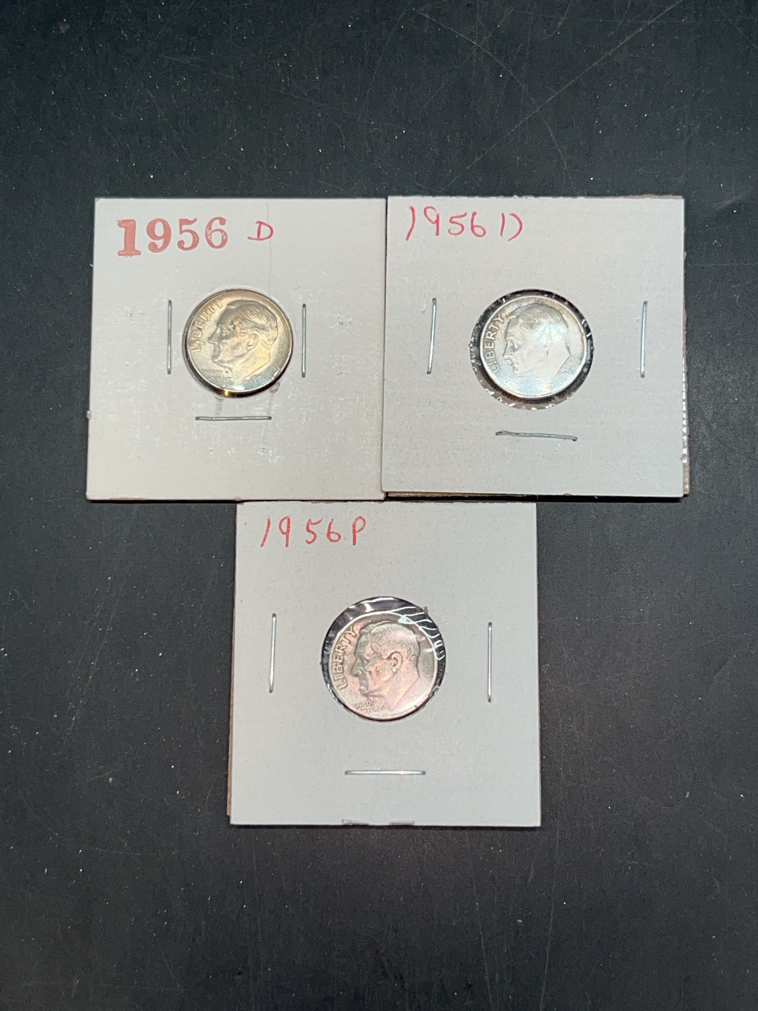 (3) 1956 Silver Roosevelt Dimes….mint mark P and D