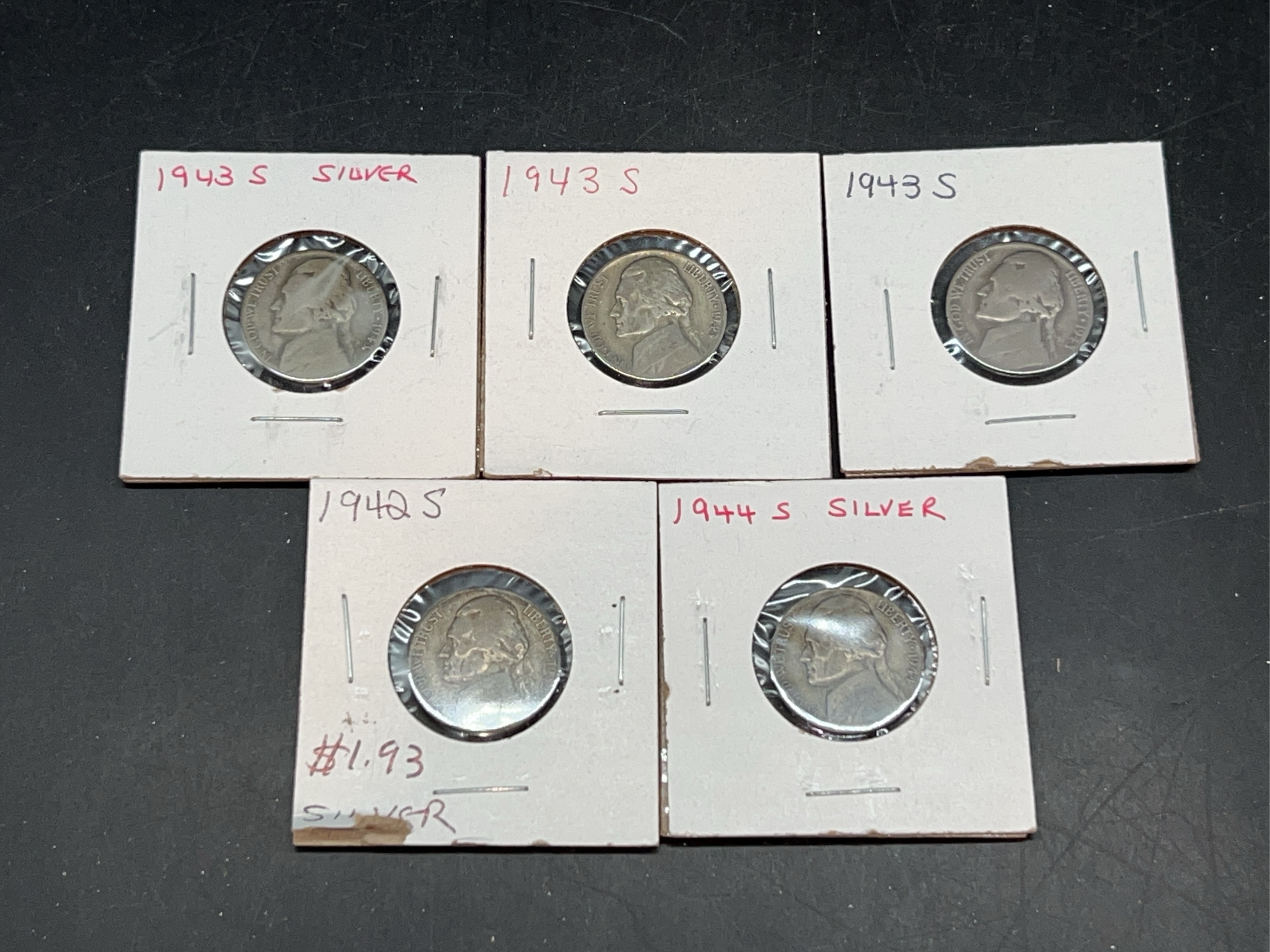 (1) 1942-S, (3) 1943-S and (1) 1944-S 35% Silver War Nickels…..has large S mint mark above dome on reverse