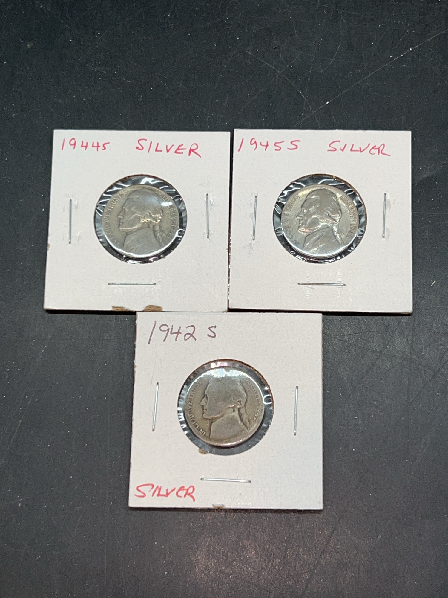 1943-S, 1945-S and (1) 1942-S 35% Silver War Nickels…..has large S mint mark above dome on reverse