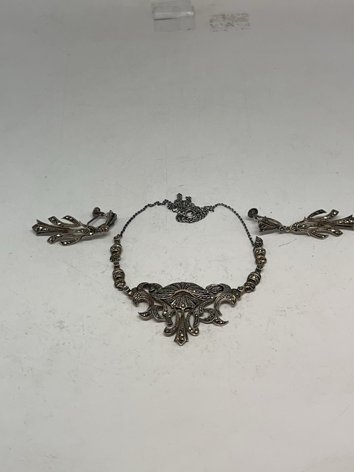 Vintage Sterling Silver Marcasite Stones Necklace & Earing Set 21.7 Grams of Silver - 17in Chain