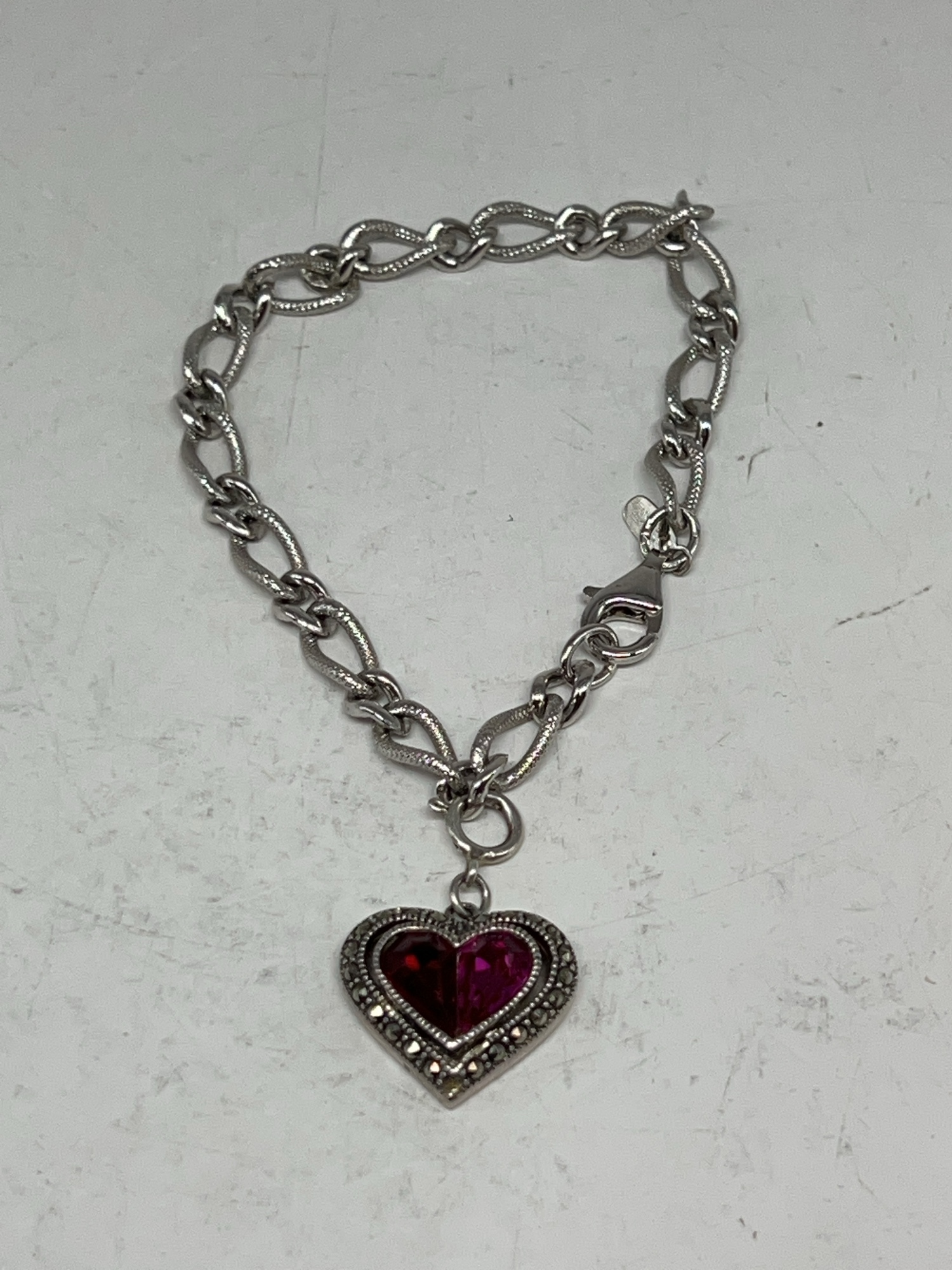 Bracelet w/ Charms Heart Shaped- Dark Pink Marked Sterling 17.5 grams Approx 7"