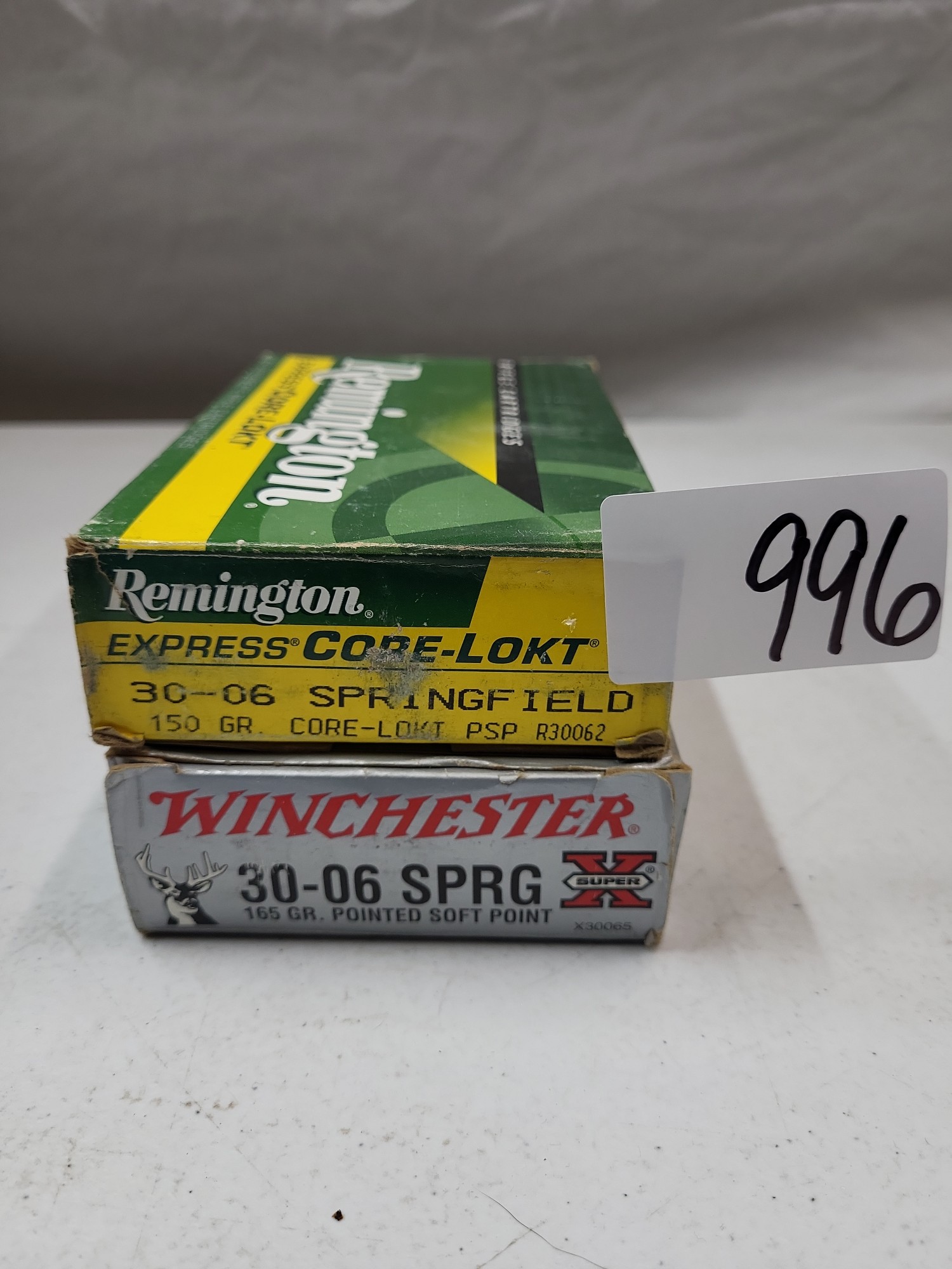 Two boxes of rifle cartridges. One box (14)Winchester Super X 30-06 SPRG. 165 GR. Pointed Soft Point. One box (19) Remington Express Core-Lokt 30-06 Springfield 150 GR. Core-Lokt PSP.