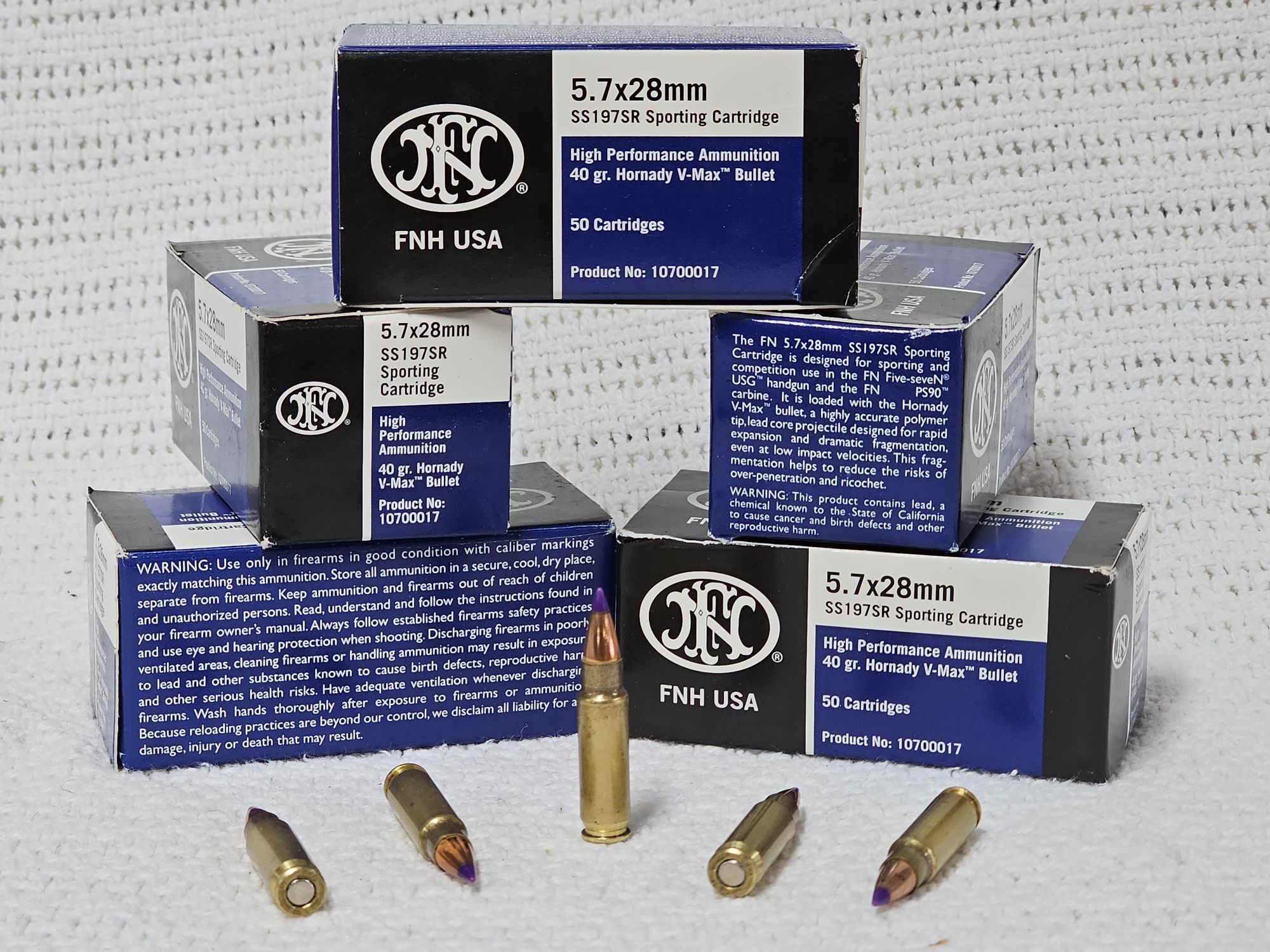 Hornady V-Max,FN 5.7x28 SS197SR Sporting Cartridges 40 gr. Ammunition(50 Cartridges each, 5 boxes)