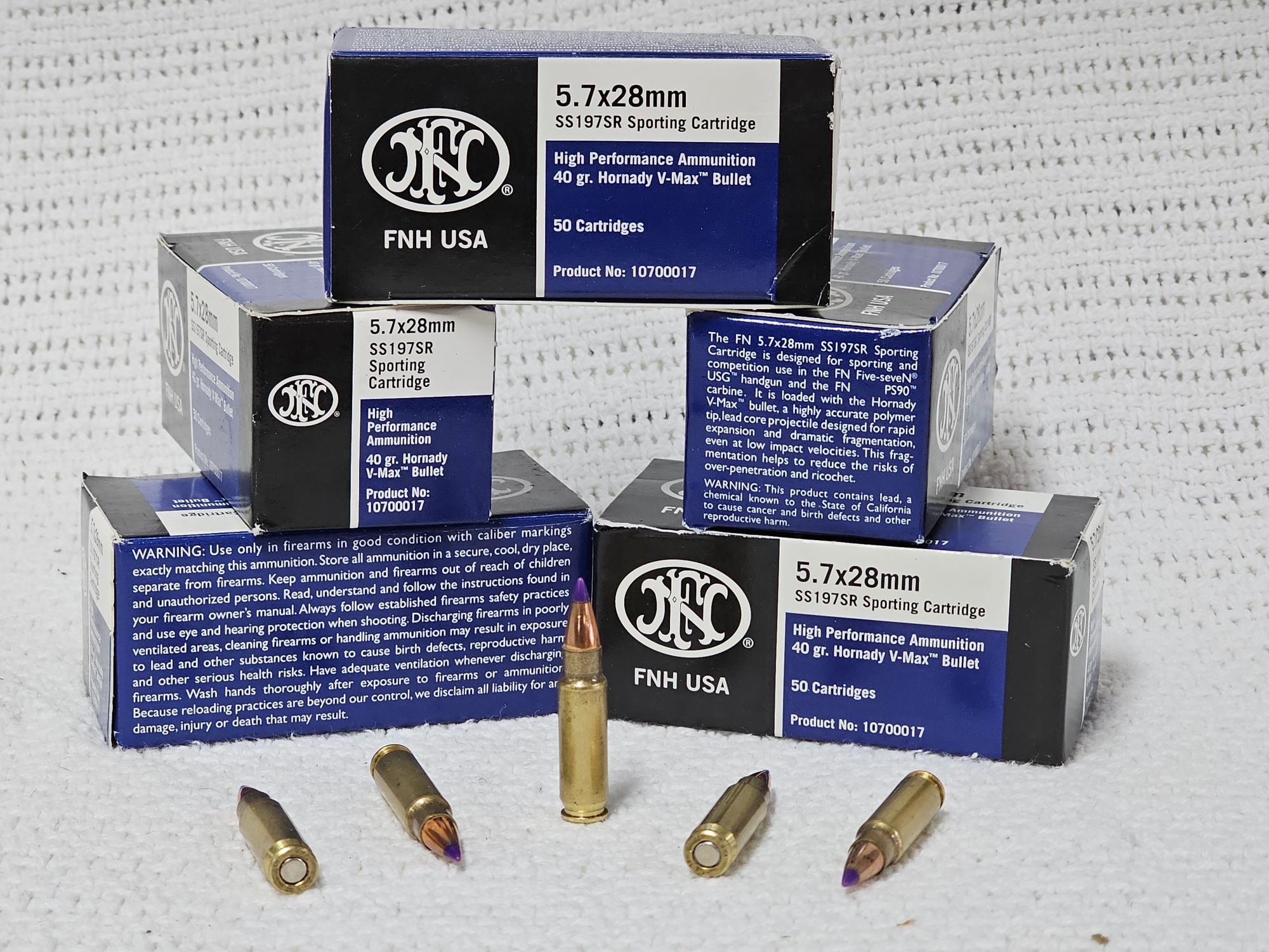 Hornady V-Max,FN 5.7x28 SS197SR Sporting Cartridges 40 gr. Ammunition(50 Cartridges each, 5 boxes)