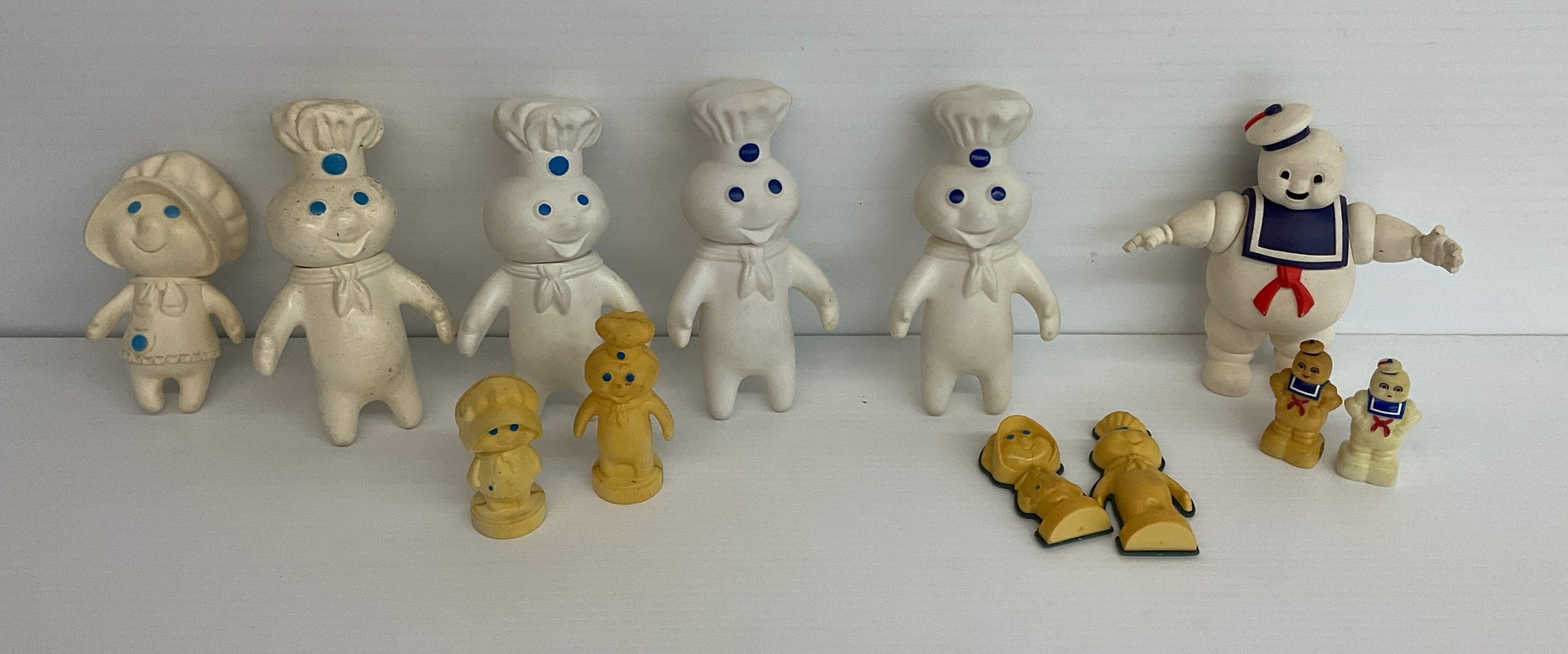 Collection of small figures, including multiple Pillsbury Doughboy characters. There are figures marked 'TPC 1971' and Stay Puft Marshmallow Man figure from Ghostbusters marked 'Columbia Pictures 1984' as well as pencil sharpeners. Tallest 7.5 in.