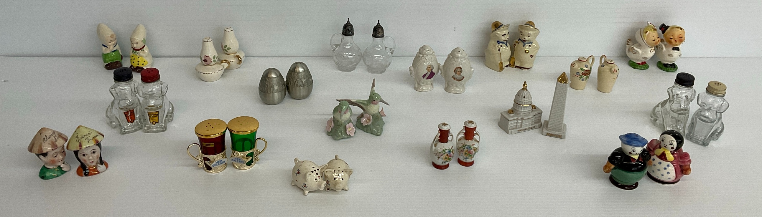 This lot includes a variety of figural and novelty shakers, including people, animals, and souvenir sets. Some are marked Made in Japan or other various countries, and are made from materials such as ceramic, glass, and metal. Tallest 4 in.