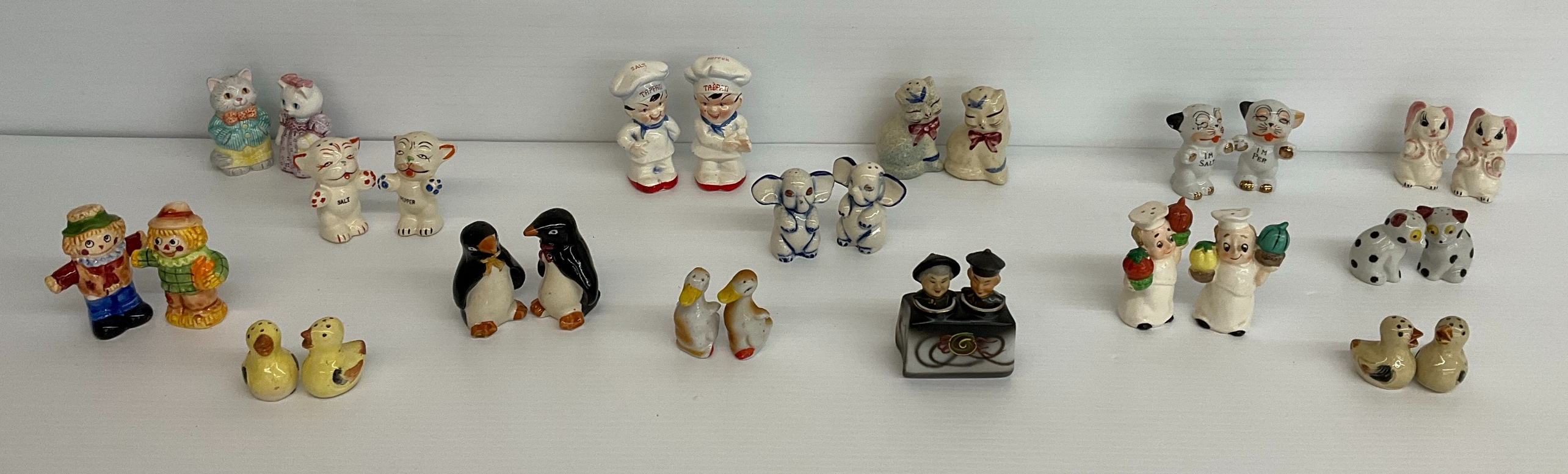 Assortment of salt and pepper shakers featuring various figures including chefs, animals, and people. Tallest 4.5 in.
