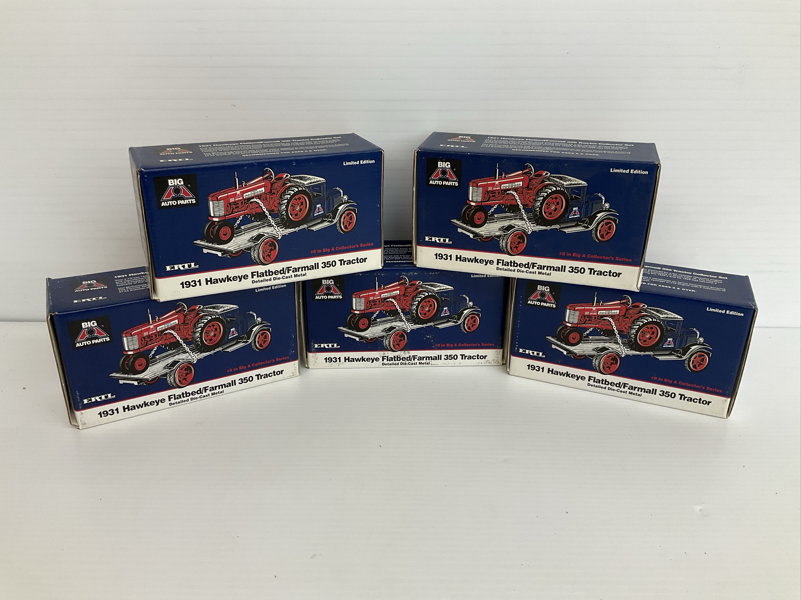 Set of five Ertl 1931 Hawkeye Flatbed/Farmall 350 Tractor Die-Cast Toys in original boxes. These were part of the Big A Collector's Series. 4.5 x 8 x 3 in.
