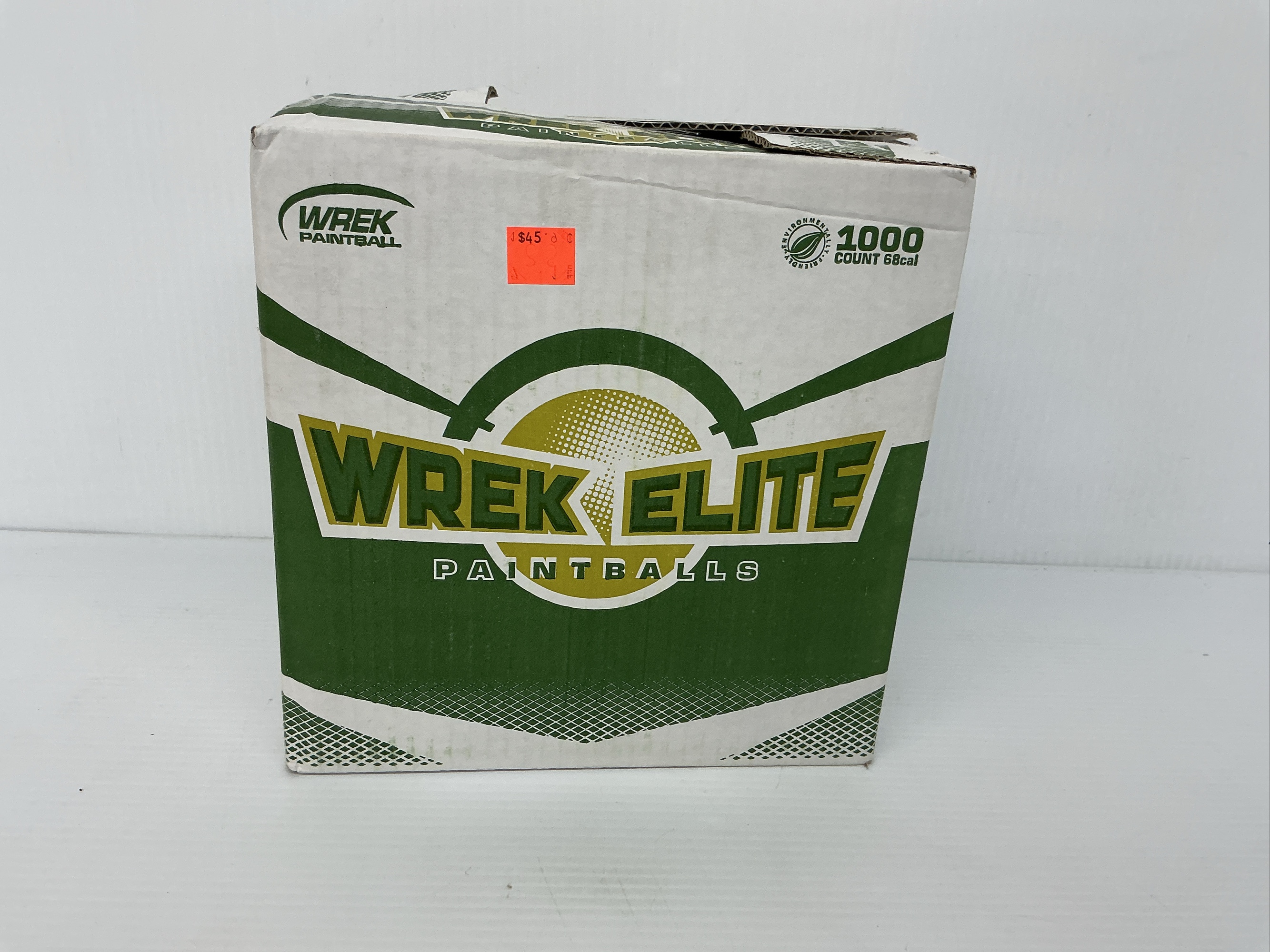 A box of Wrek Elite paintballs, containing 1000 paintballs. Perfect for your next paintball game or practice session.