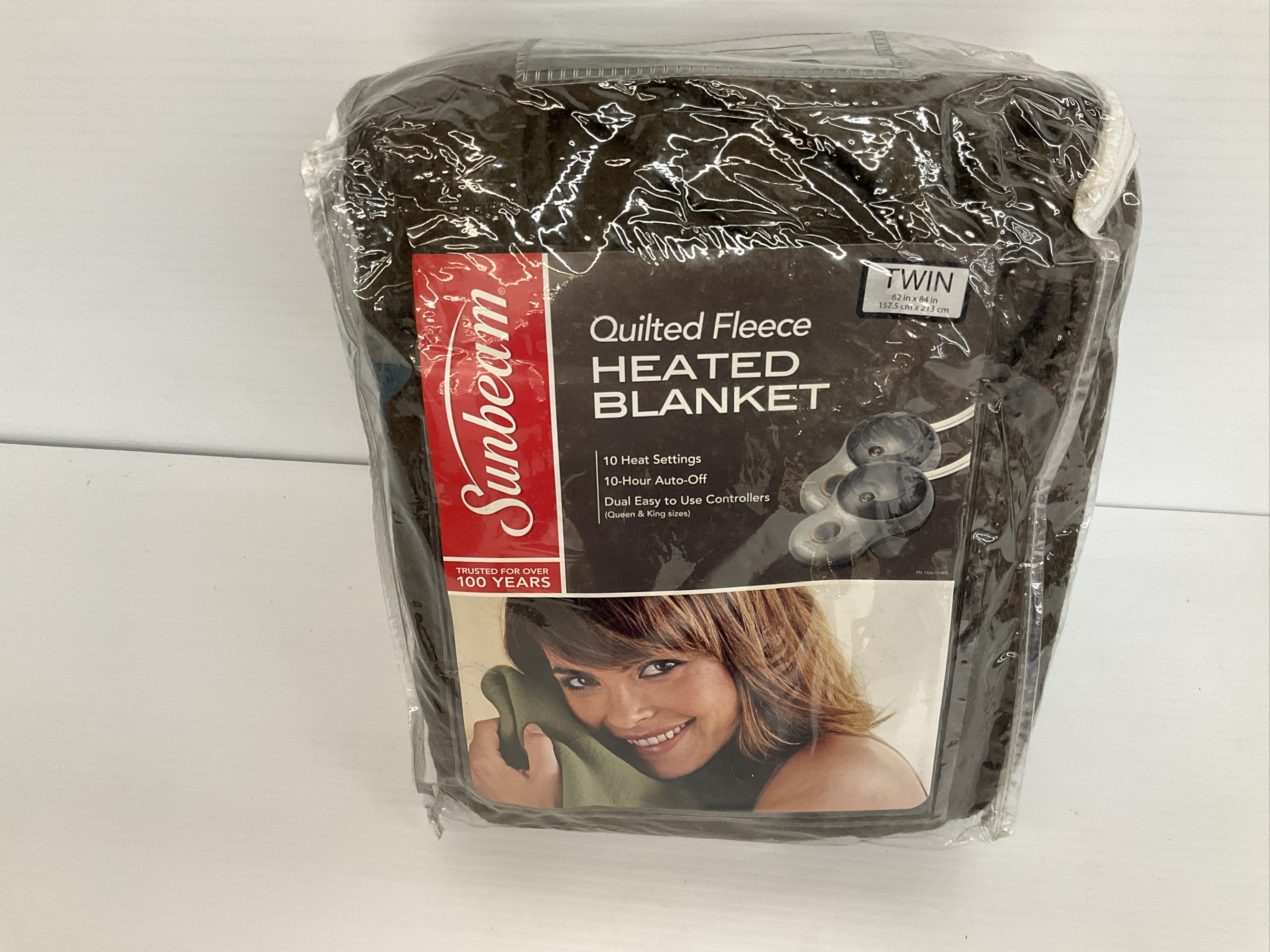 This is a Sunbeam Quilted Fleece Heated Blanket. Twin size with dual easy-to-use controllers and 10 heat settings. Used in package. 62 x 84 in.