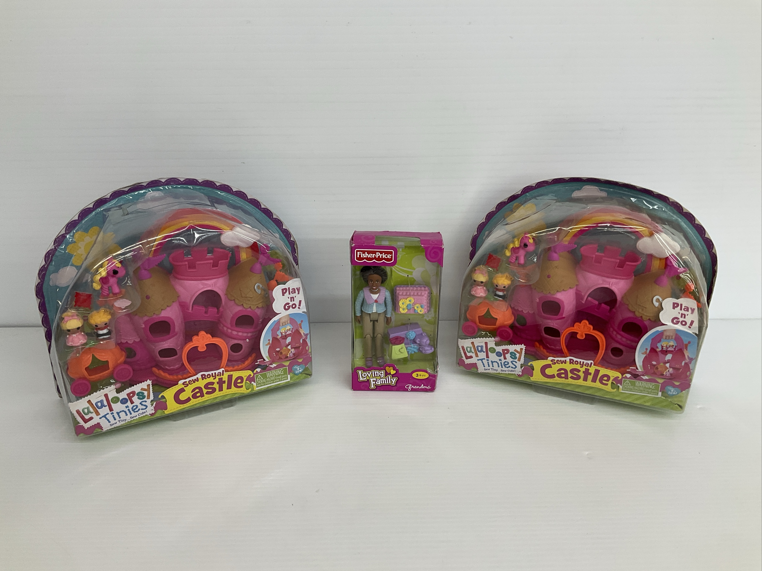 You're bidding on a Fisher-Price Loving Family Grandma doll with accessories, still sealed in its original packaging. Also included are two Lalaloopsy Tinies Sew Royal Castle playsets, also in their original packaging.