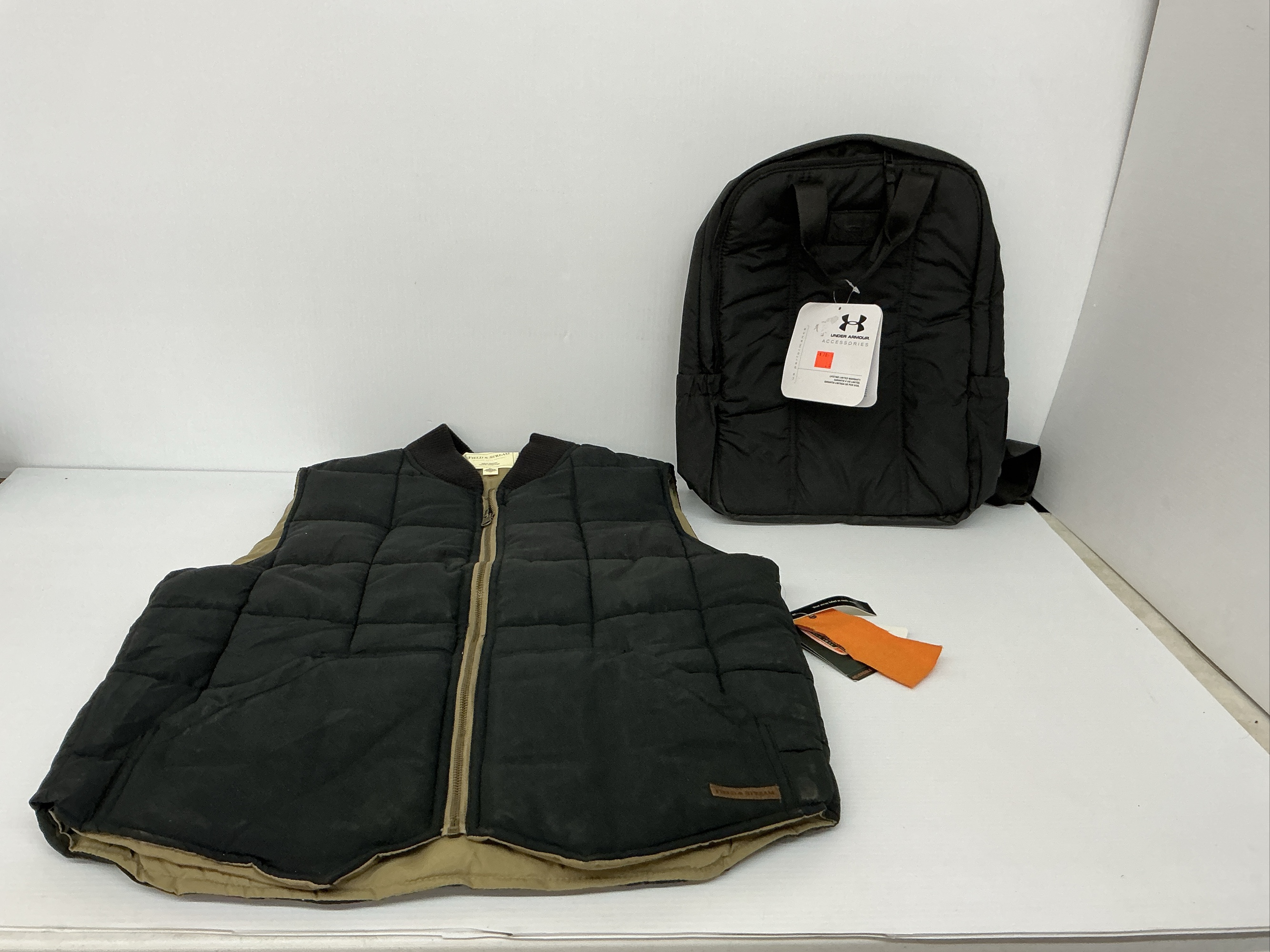 Included in this listing is an Under Armour black backpack with tags still attached and a black Field & Stream reversible quilted vest in a size small.