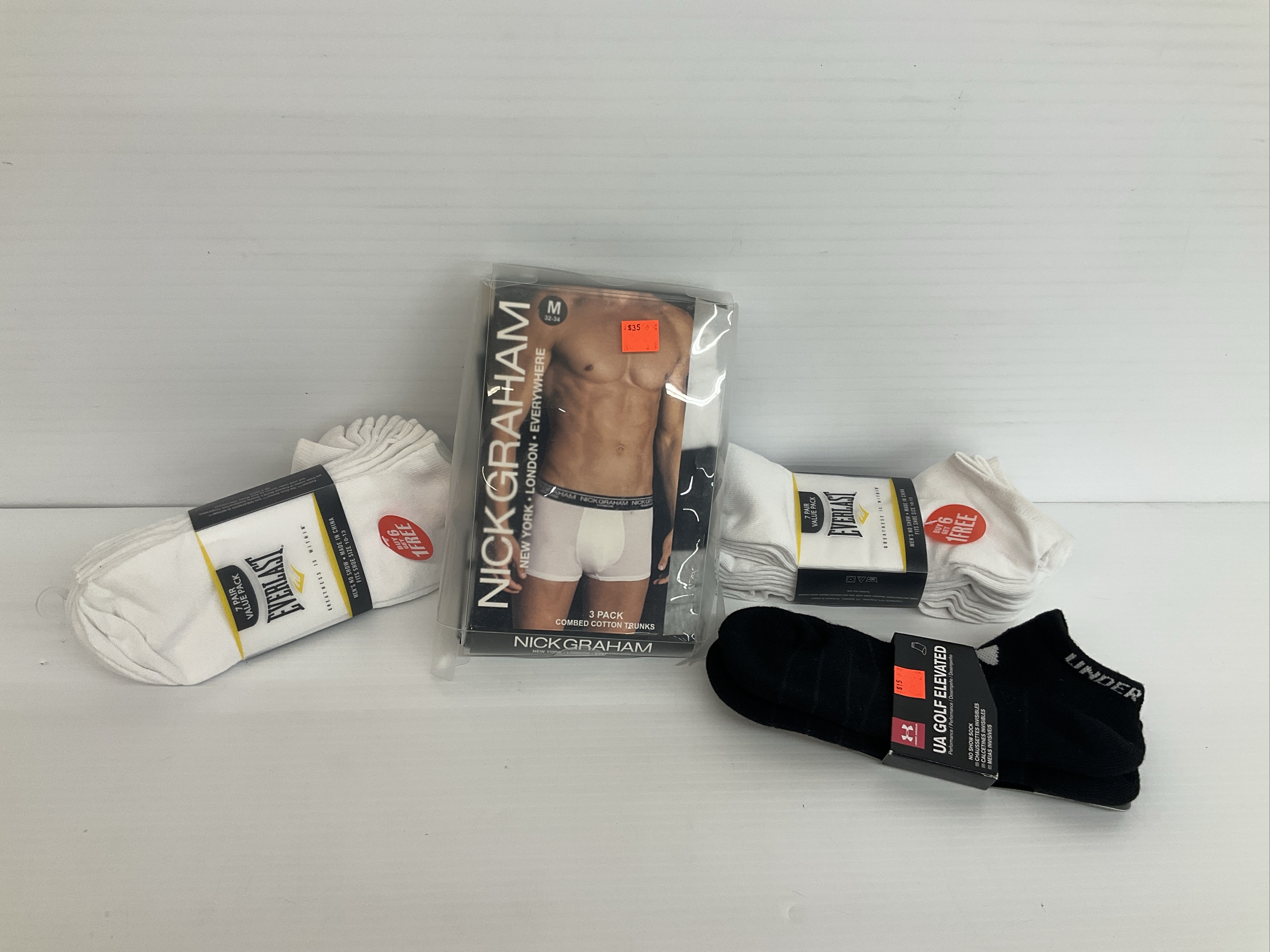 This lot contains a selection of new men's socks and underwear, including Everlast white socks (2 packs), Under Armour black golf elevated socks, and Nick Graham 3-pack combed cotton trunks size medium.
