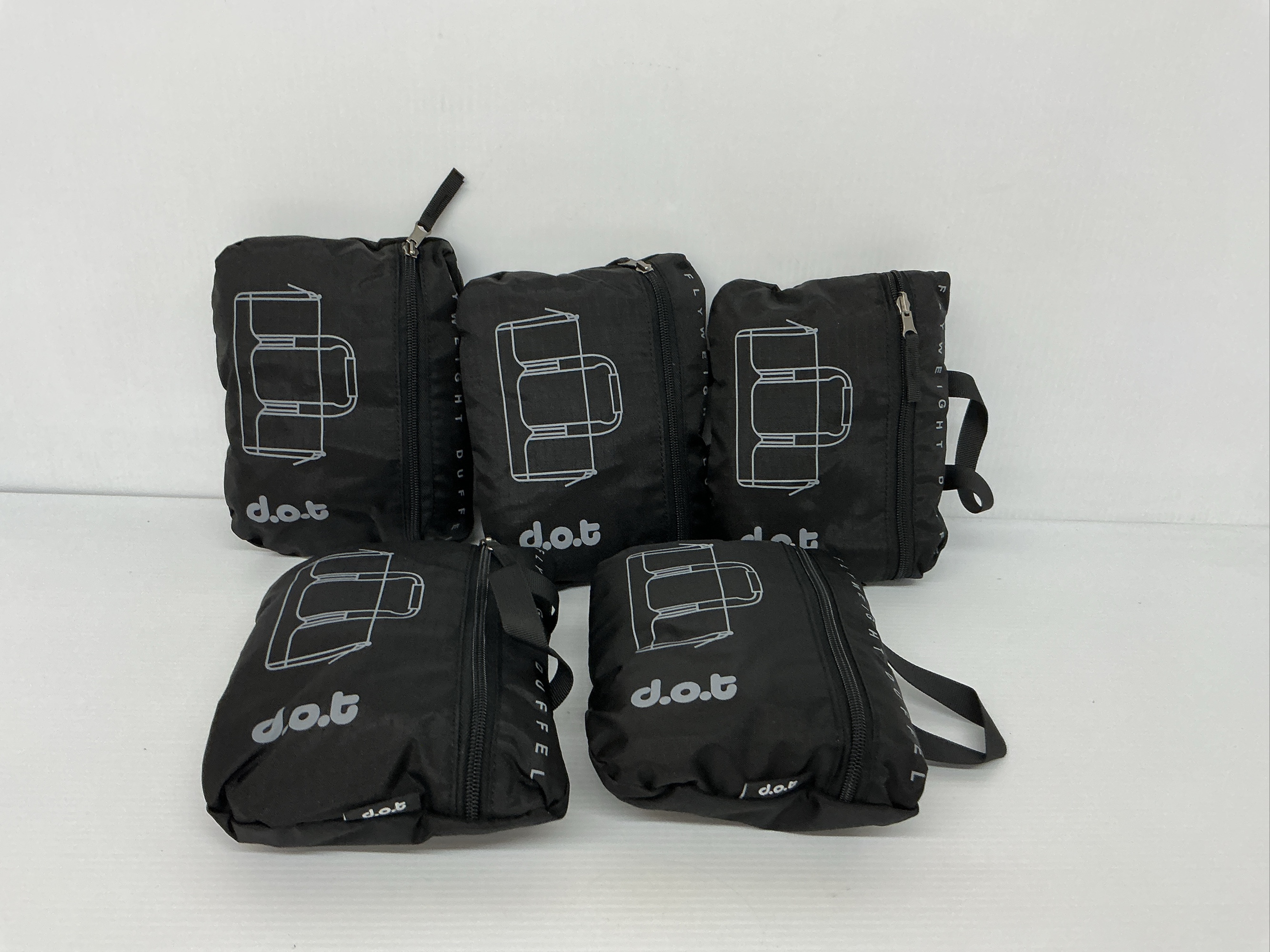 You're bidding on five black Flyweight D.O.T. duffel bags that fold into a compact pouch. Each bag features a carry strap and a compact, foldable design for easy storage and transport.