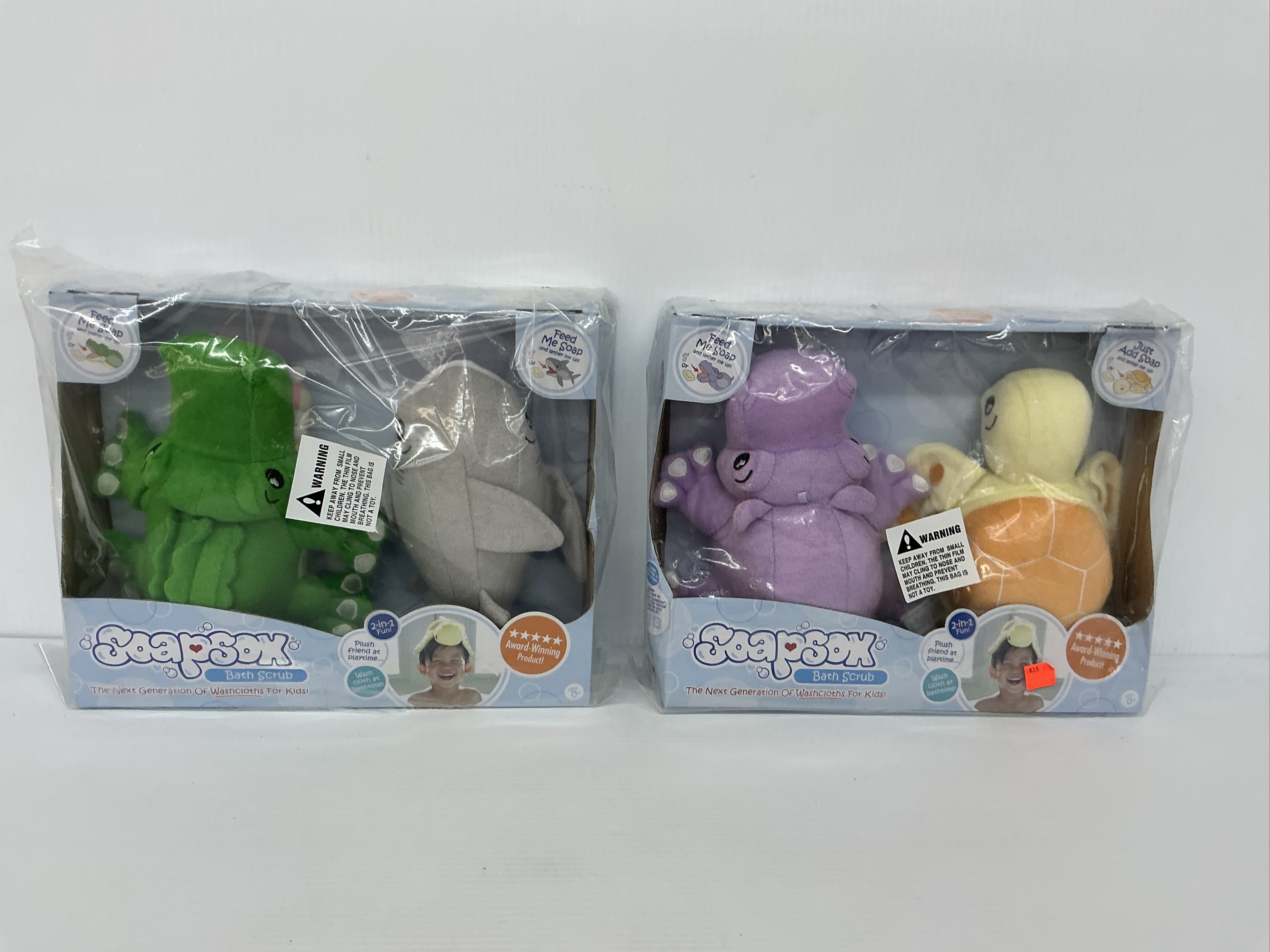 Two boxed sets of SoapSox bath scrubs for kids. One set includes an Alligator and a Shark, and the other set includes a Hippo and a Turtle. These are designed to be plush friends that can be used as washcloths in the bath.