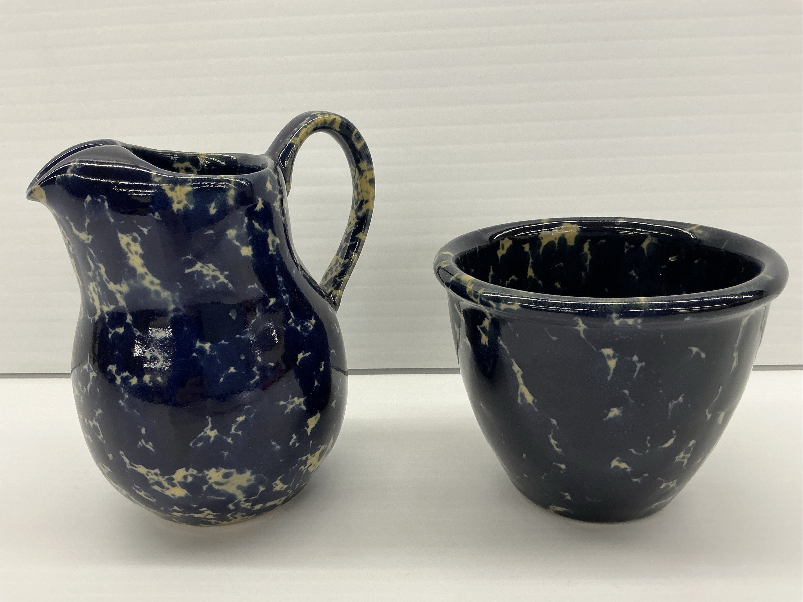Spongeware 6 inch pitcher and bowl set in dark blue with tan spots. These pieces would make a wonderful addition to your collection.