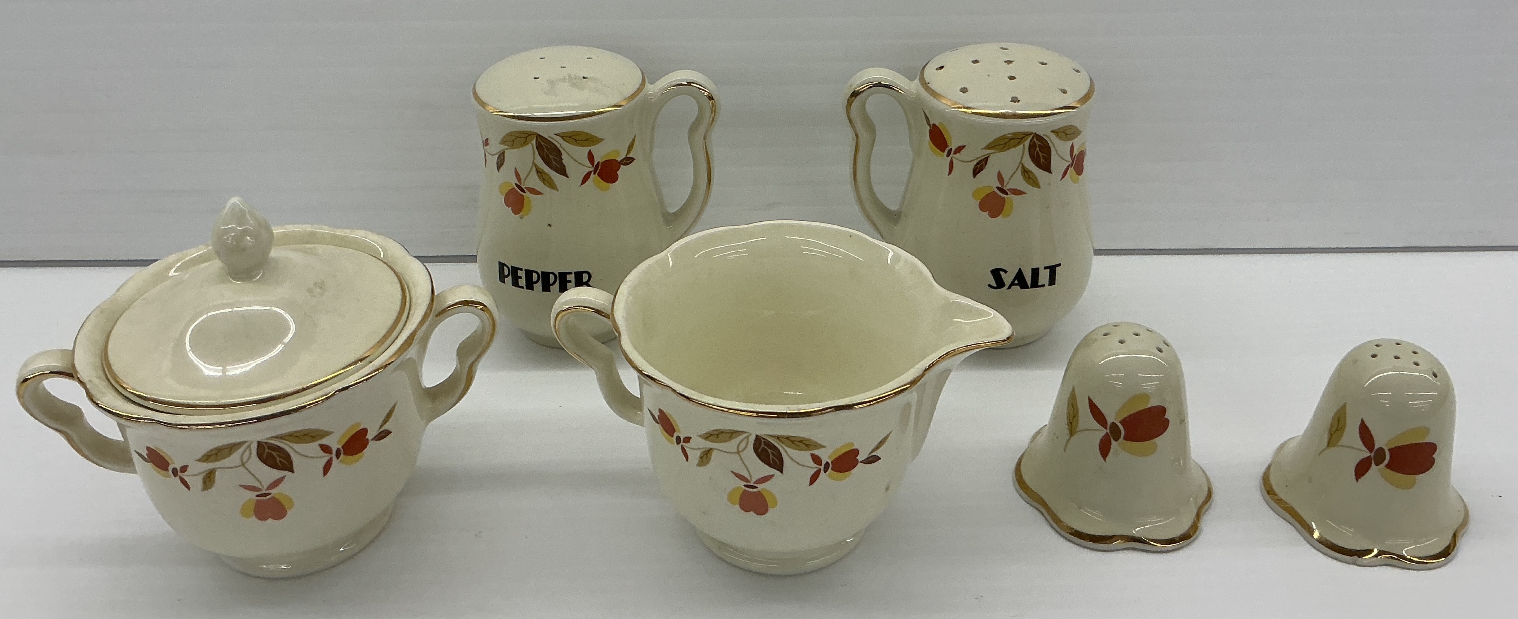 Dinnerware includes a covered sugar bowl, creamer, salt and pepper shakers with handles, and salt and pepper shakers. All feature the autumn leaf floral design. The set is marked “Superior Hall Quality Dinnerware, Tested and Approved by Mary Dunbar, Jewel Homemakers Institute”. Tallest 4.25 in.