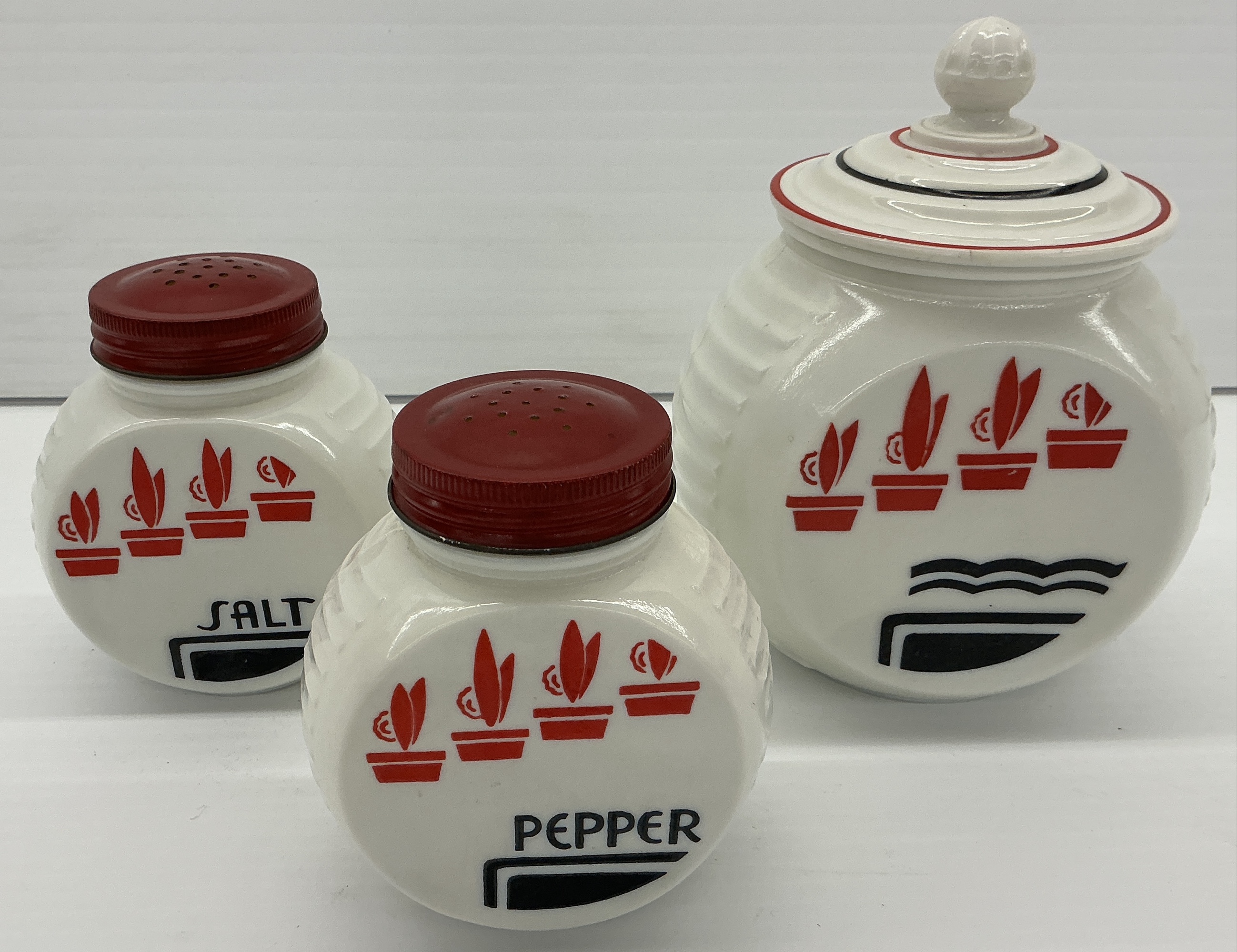 Offered is a Fire King Vitrock salt & pepper shaker set and grease jar. These pieces display a red and black planter design. Tallest 6.5 in.