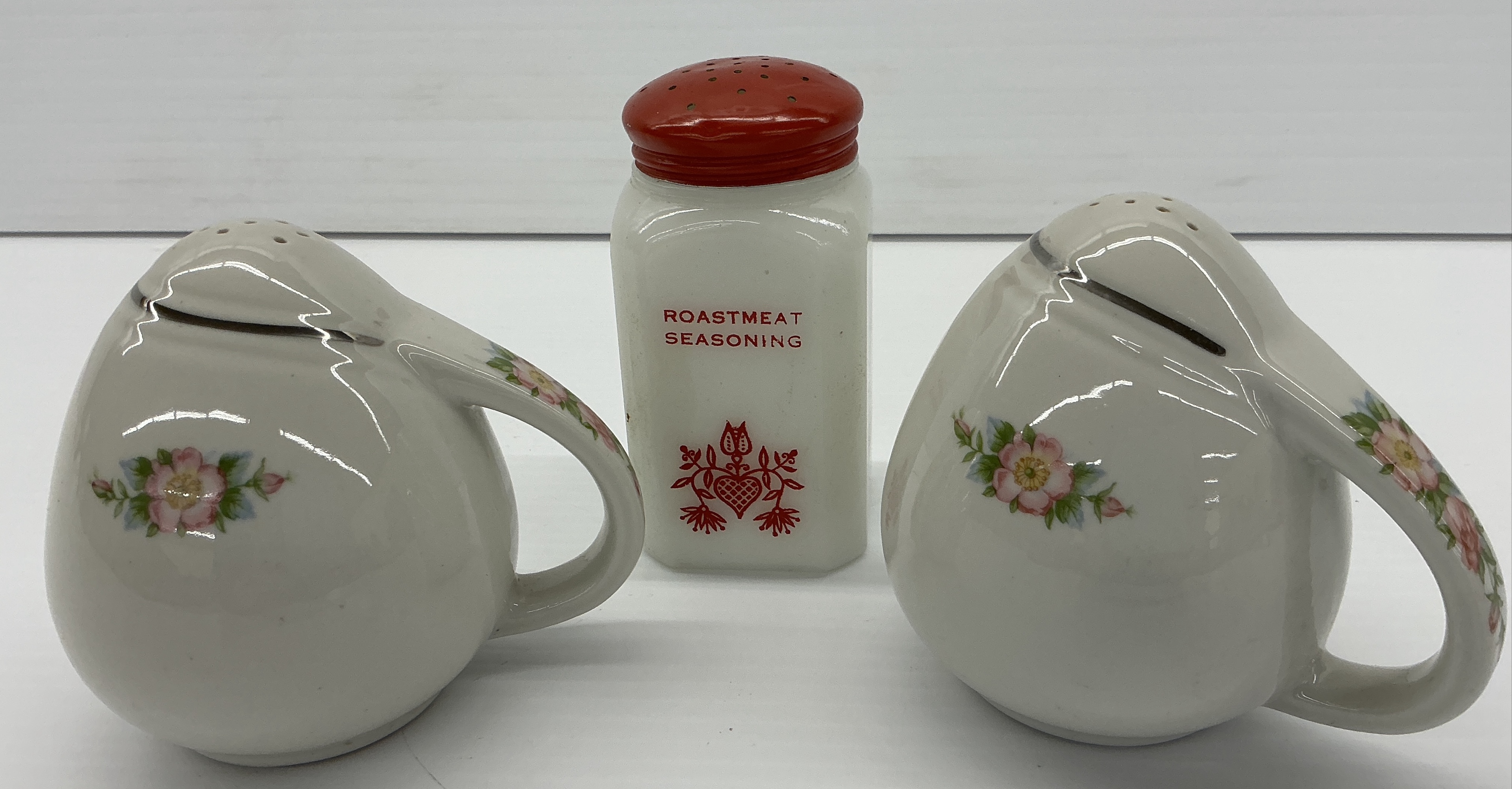 Group of vintage shakers. One Hall Salt & Pepper shaker set with floral design, and one Roastmeat Seasoning shaker. Tallest 5 in.