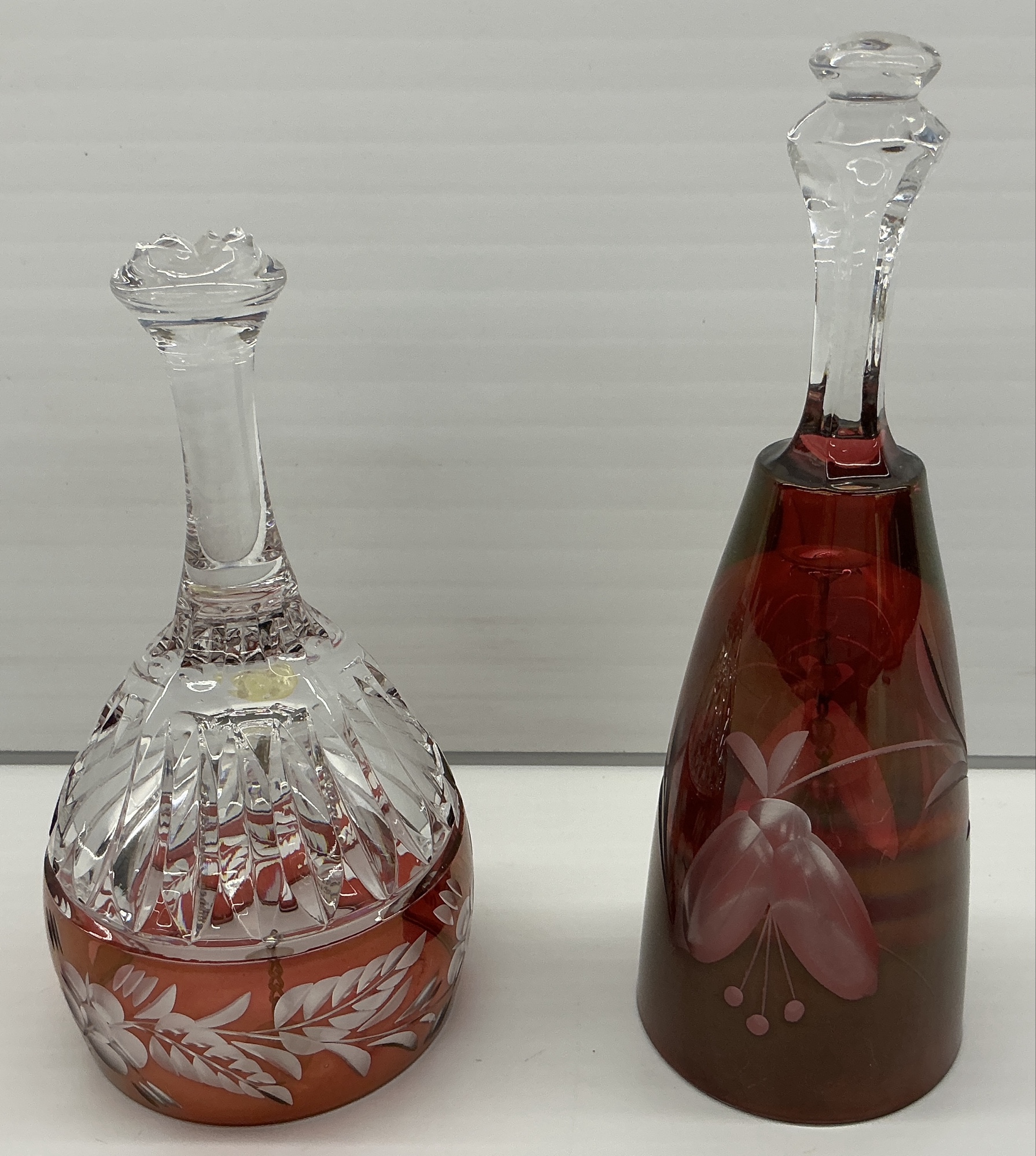 Offered are two vintage decorative bells. One is ruby cut to clear crystal with a frosted floral design. The other bell is ruby red glass with an etched floral design. Tallest 6.5 in.