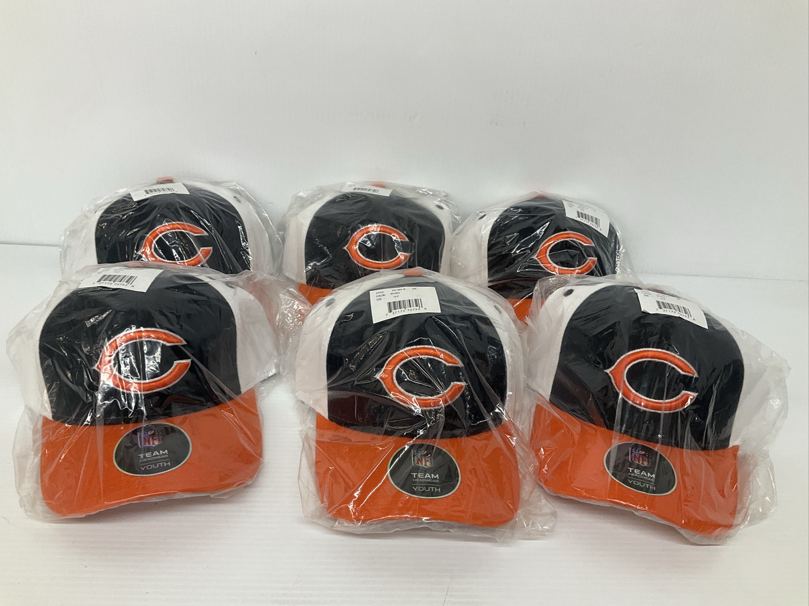 This auction is for a lot of 6 Chicago Bears baseball caps, size youth. Each cap is team headwear with team colors and logo. Caps come individually wrapped.