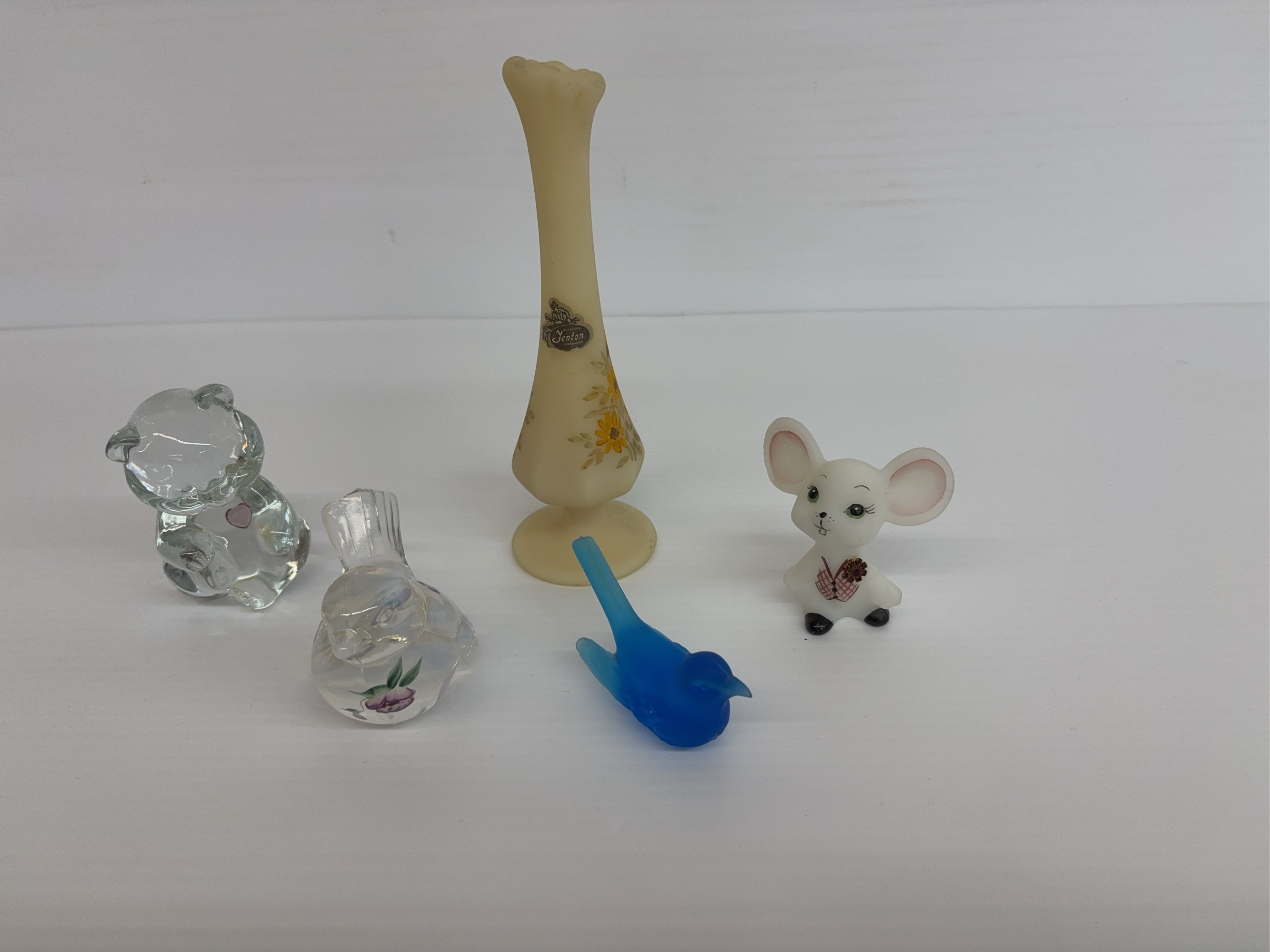 Collection of various glass figurines, including Fenton USA vase, clear Fenton teddy bear, Fenton bird, Fenton mouse and Westmoreland blue bird figurine. Tallest 7.75 in.