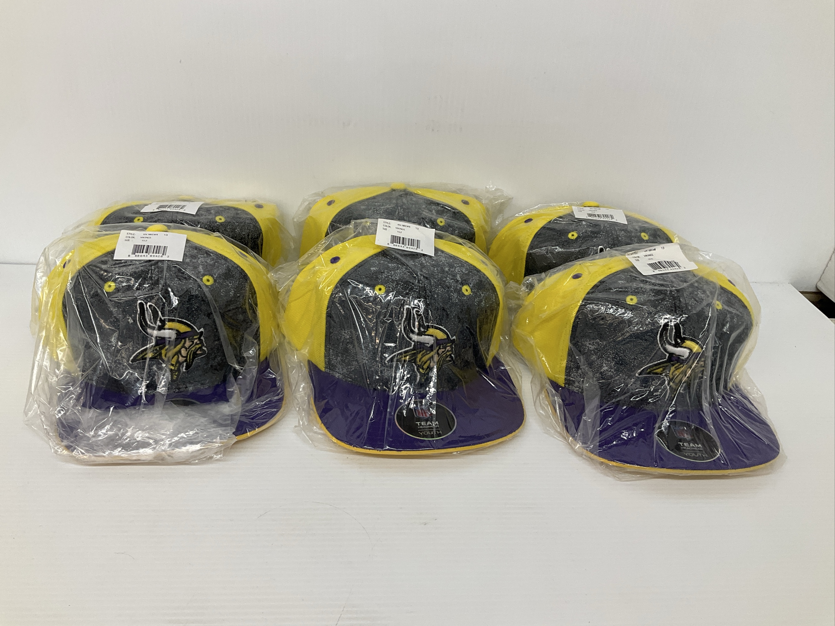 You are bidding on a lot of six youth-sized snapback hats featuring the Minnesota Vikings team logo. Each hat has a unique color combination of yellow, black and purple. "Minnesota Vikings" is embroidered on the back of each hat.