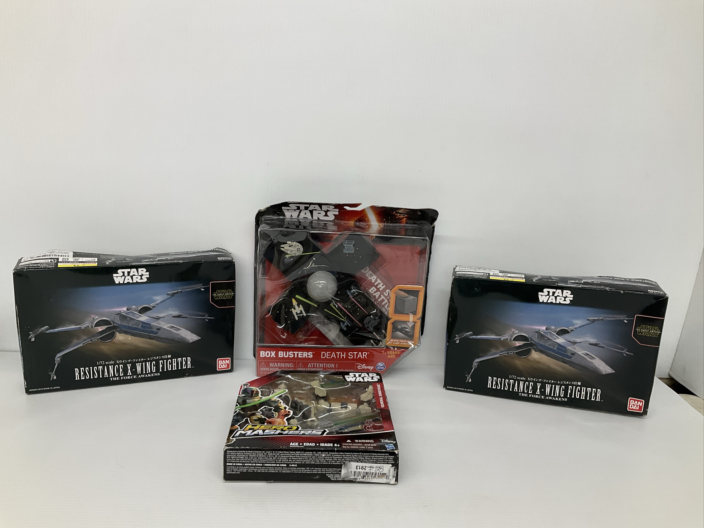 This lot includes Star Wars action figures and collectibles, including two Resistance X-Wing Fighters, a Death Star Battle set, and a Hero Mashers General Grievous figure. All come in original packaging.