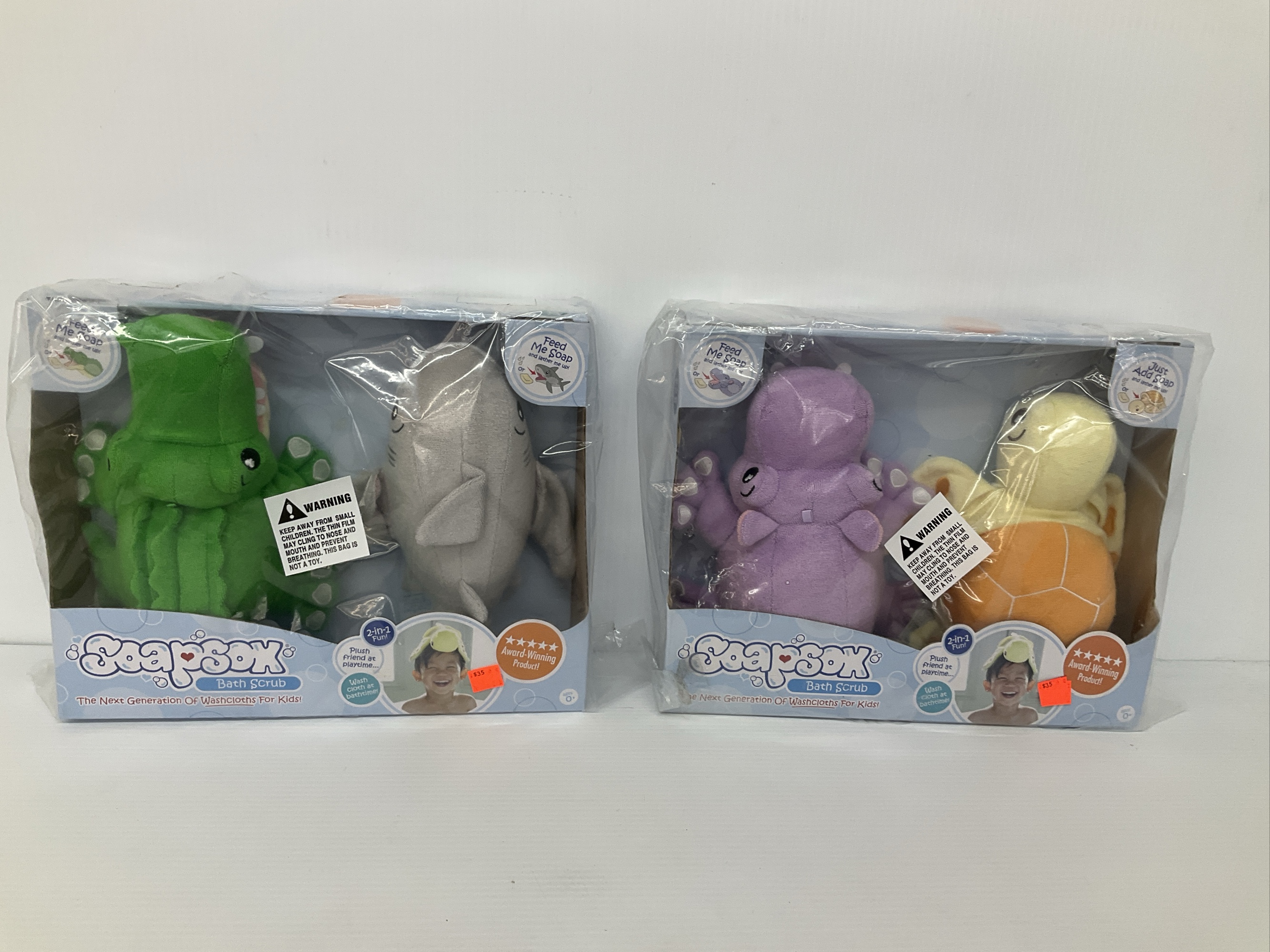 You are bidding on a lot of SoapSox 2-in-1 bath scrub washcloths for kids. The lot includes four sets of SoapSox bath scrubs. The sets are comprised of the following: Crocodile & Shark, Octopus & Turtle. These SoapSox are new in their original packaging.