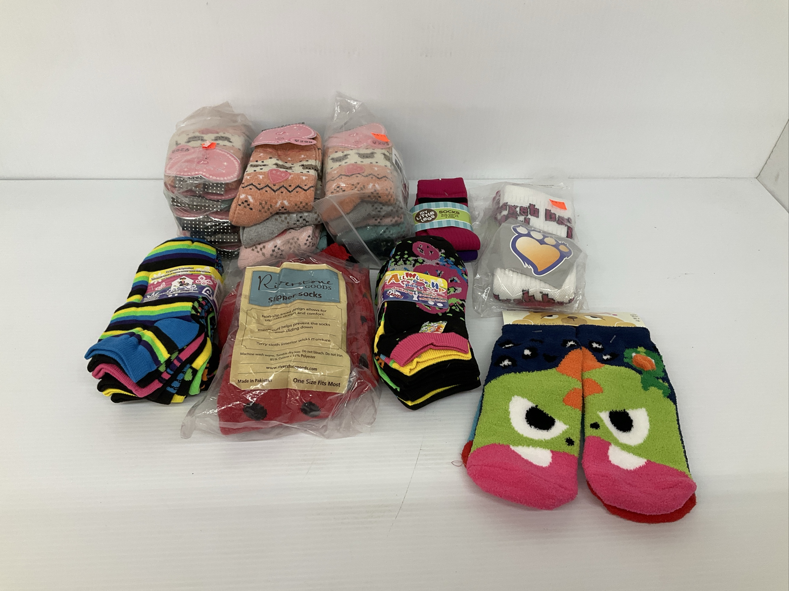 This lot includes a variety of children's socks in different styles, colors, and sizes. There are multiple pairs of slipper socks, some with cartoon characters and other with geometric and polka dot designs. Some socks are labeled for 12-24 month olds, while others are marked as one size fits most.