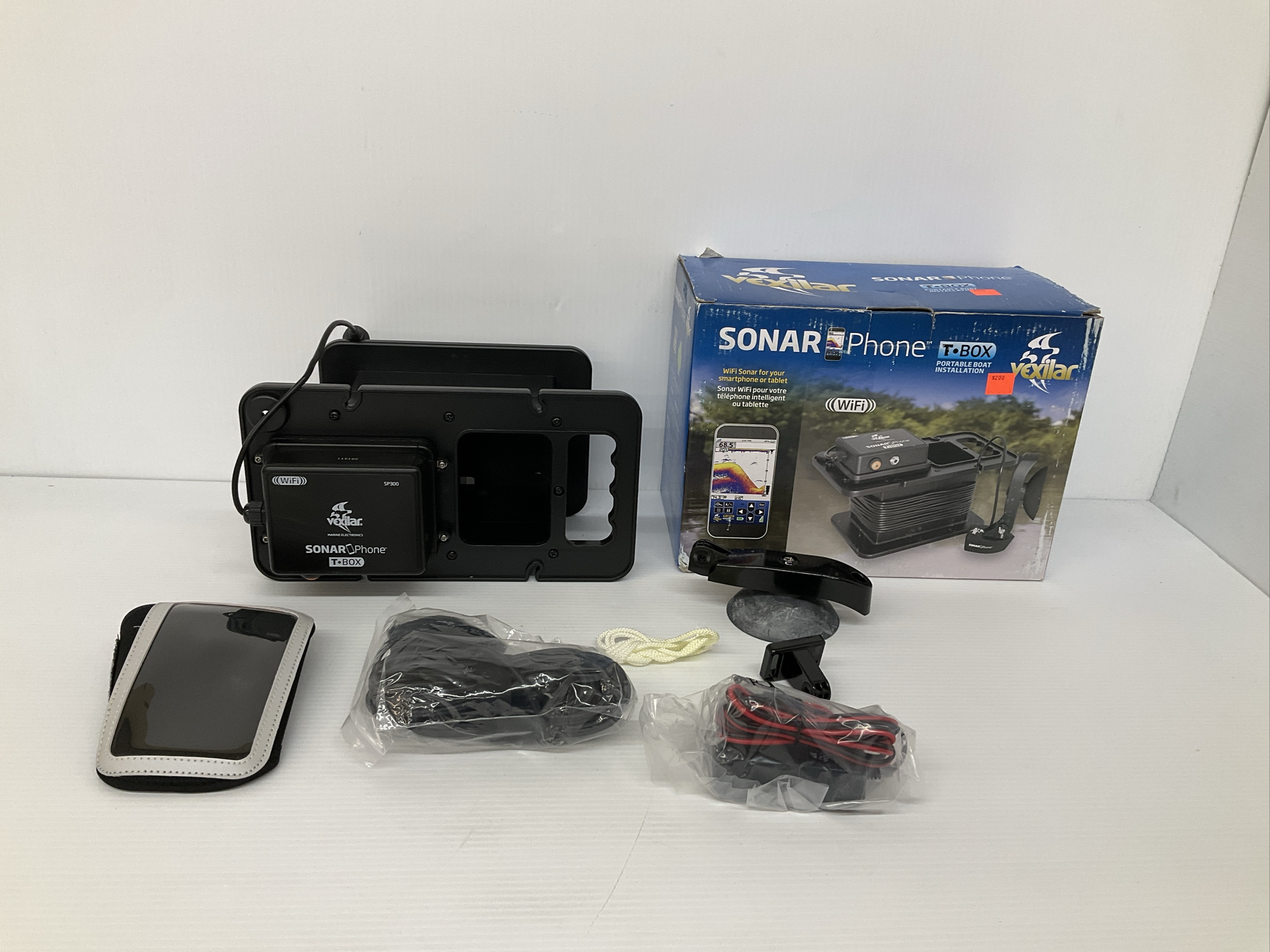 Vexilar Sonar Phone T-Box Portable Boat Installation. Includes the rigid carry case which holds the cable and battery. Includes the portable suction cup mount bracket and digital charger.