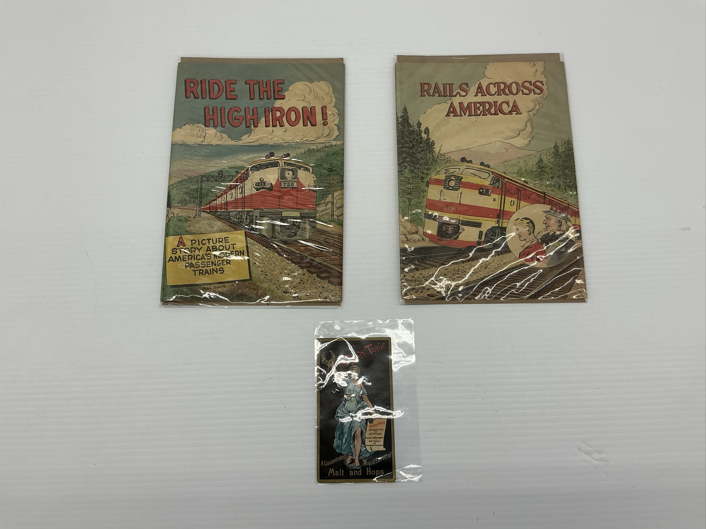 Two 1955 pieces titled 'Ride the High Iron' and 'Rails Across America', both appearing to be train-related. Included is a promotional card for The "Best" Tonic Malt and Hops. Largest 10.5 x 6.75 in.