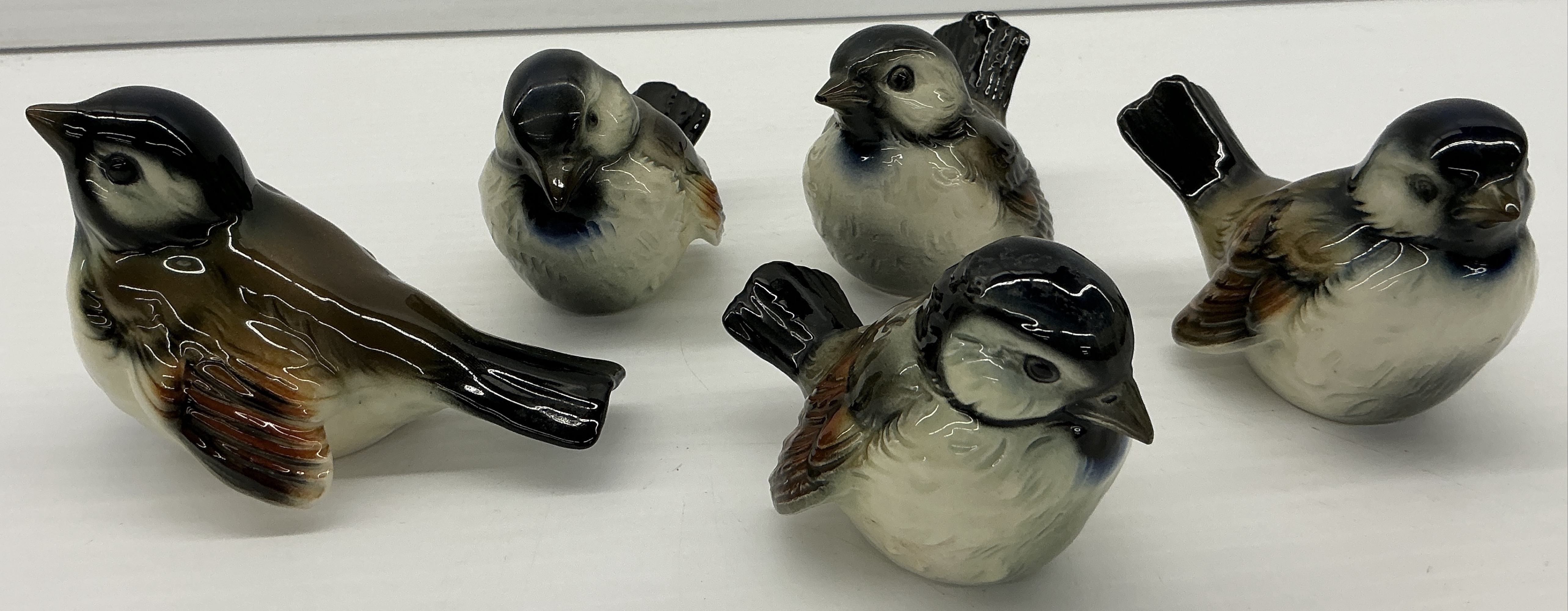 This group consists of five Goebel sparrow figurines. Each figurine is delicately crafted and displays unique markings and poses. These adorable birds are sure to add a touch of nature to any home or collection. Made in Germany. Tallest 2.75 in.