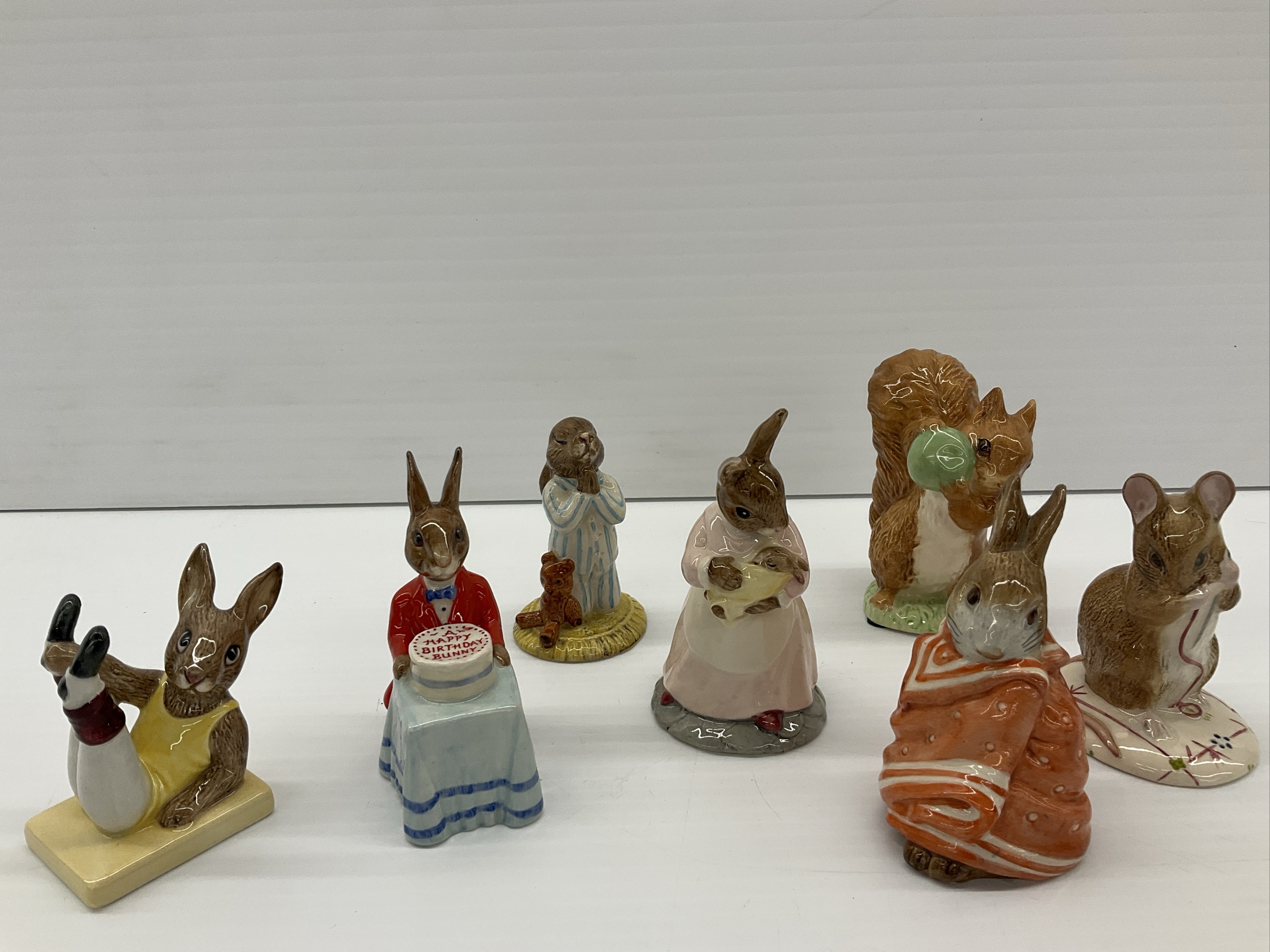 Collection of charming Royal Doulton Bunnykins and Royal Albert Beatrix Potter figurines, including Mother and Baby Bunnykins DB 167, Aerobic Bunnykins DB 40, Bedtime Bunnykins DB 55, Squirrel Nutkin, Peter Rabbit, and No More Twist. Tallest 3.75 in.